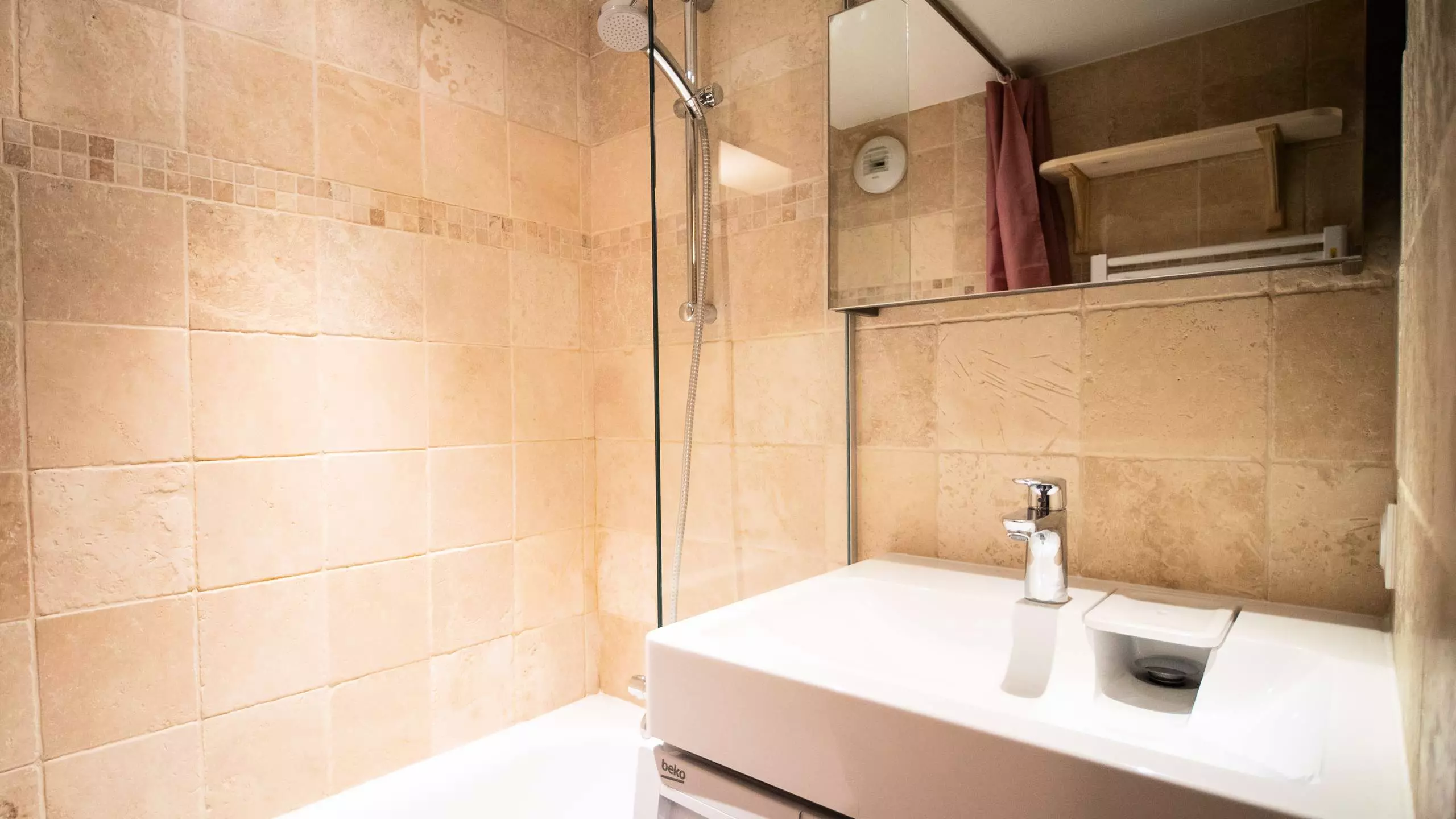 - Une salle de bain avec un sèche-serviette et un toilette indépendant.