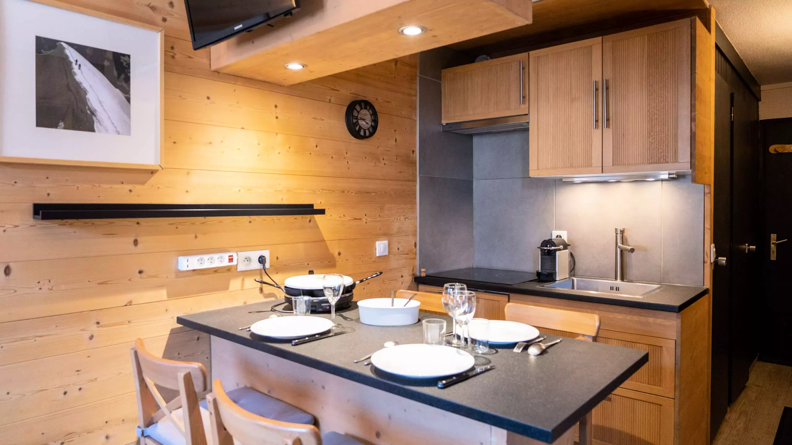- Kitchenette toute équipée pour 4 personnes avec 4 plaques vitro-céramiques, lave-vaisselle, micro-ondes, réfrigérateur, cafetière électrique, cafetière Nespresso, grille-pain et bouilloire.