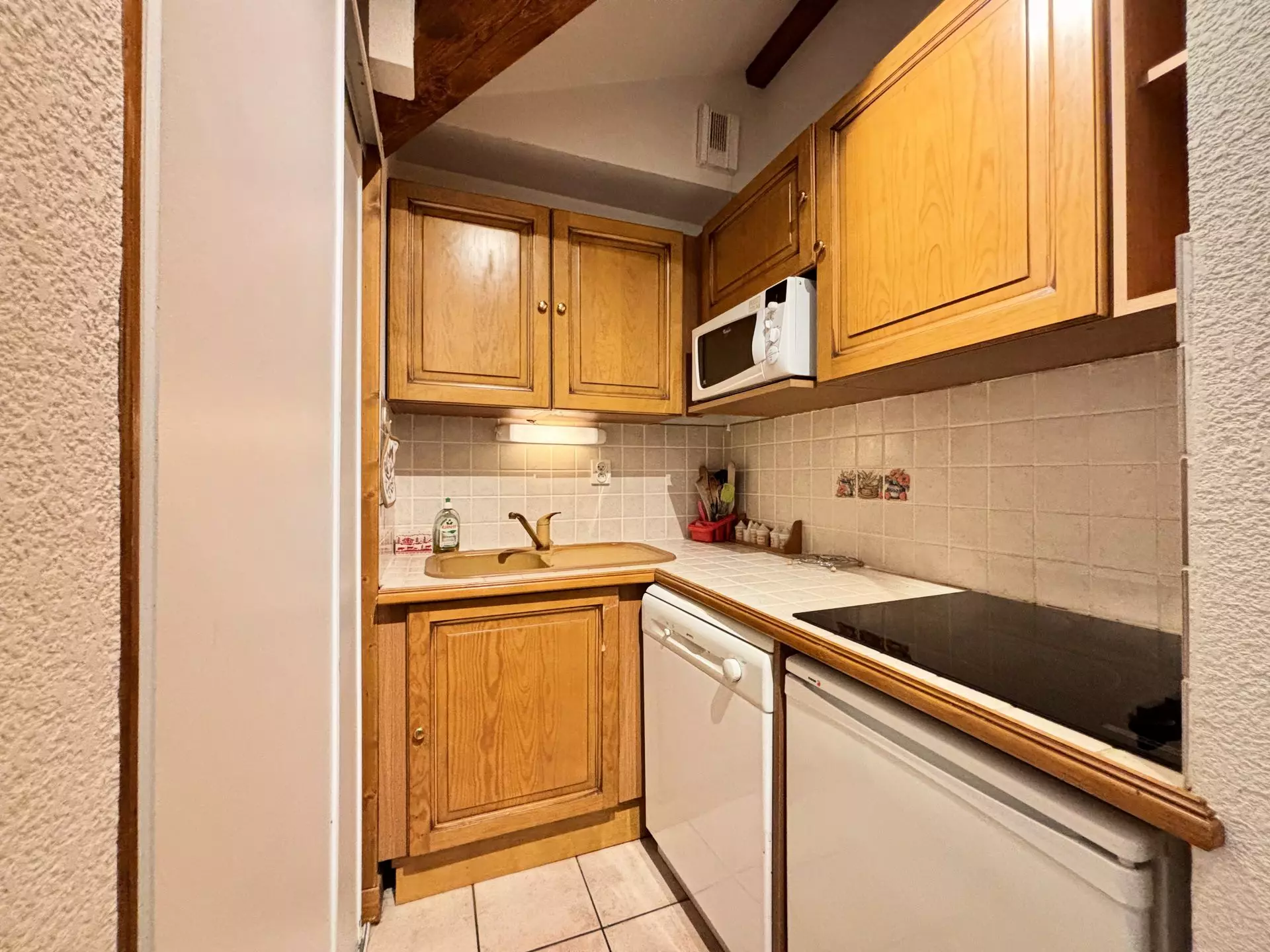 - Cuisine ouverte sur séjour : quatre plaques vitrocéramiques, réfrigérateur, four combiné micro-ondes, lave vaisselle, lave linge (situé dans la chambre).