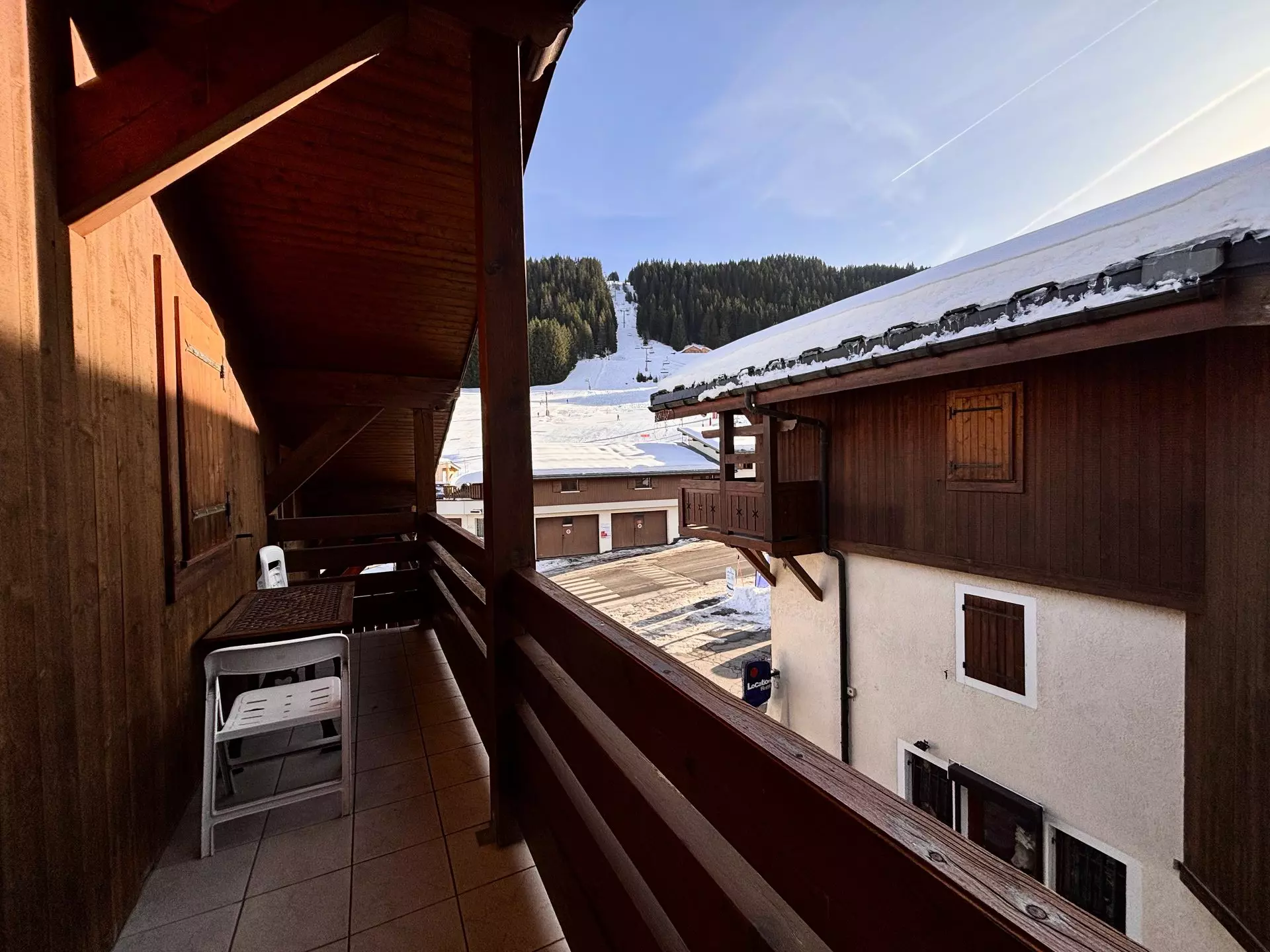 Bel appartement au pied des pistes du Mont Rond à 1350m, pour quatre voyageurs. D'une surface de 28m², il comporte un balcon ouest avec vue sur le départ des pistes, le Mont Charvin et la vallée.