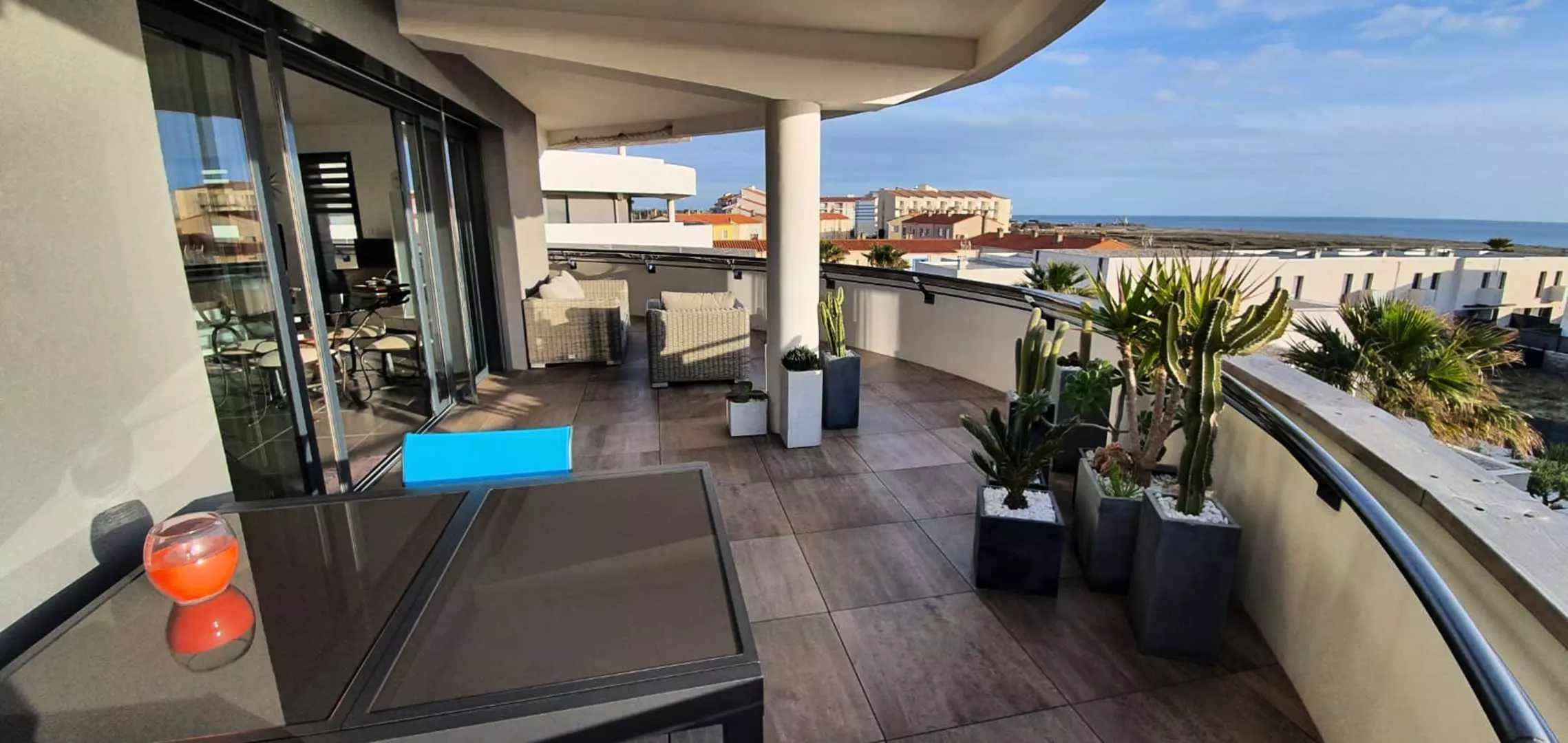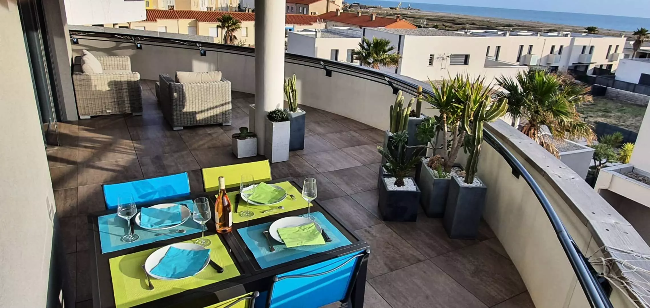 Grande terrasse de 22 m² avec coin repas et vue sur la mer