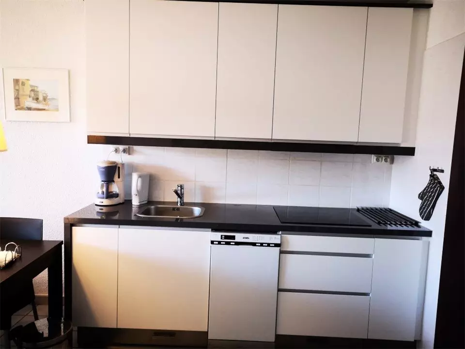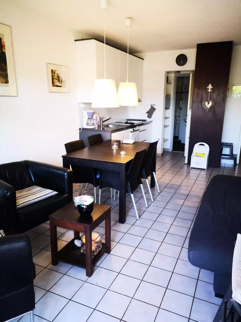 Appartement fonctionnel disposant d'une cuisine ouverte sur la pièce de vie, une chambre avec lits jumeaux et une salle d'eau avec WC. Le salon-séjour dispose d'un canapé convertible (couchage en 140).