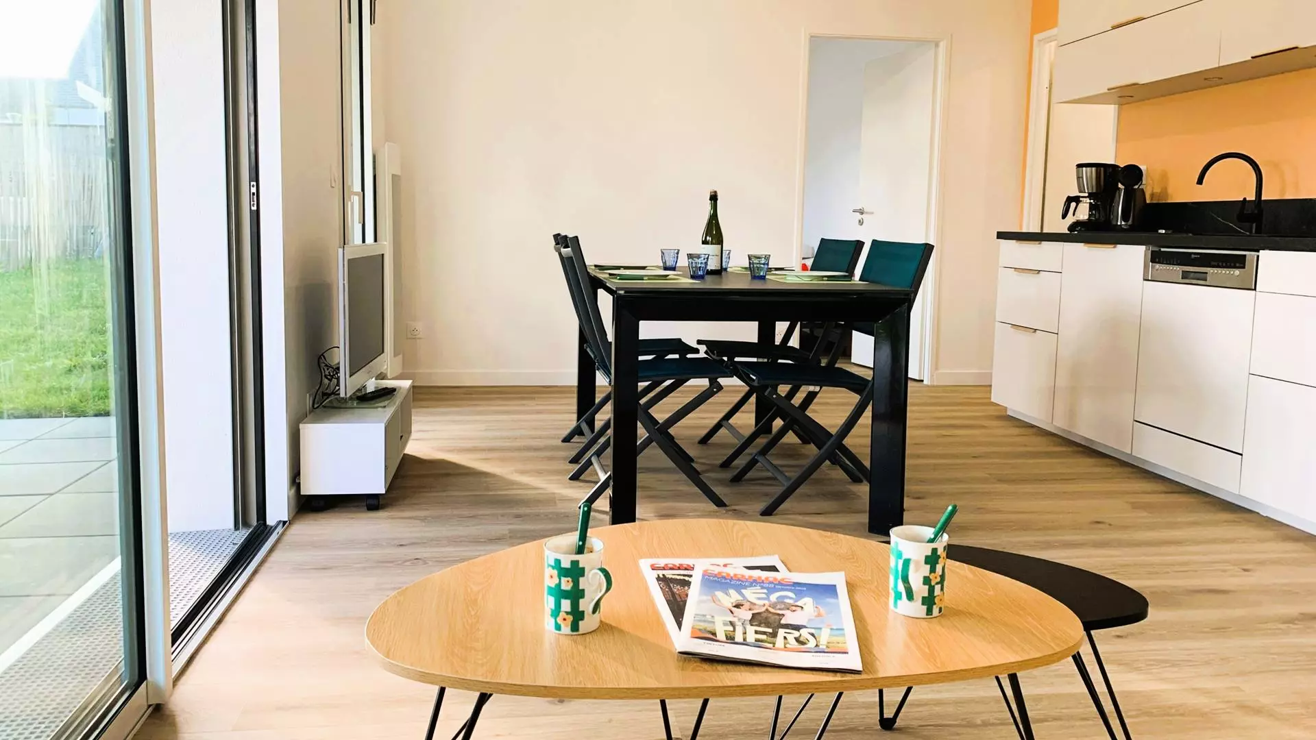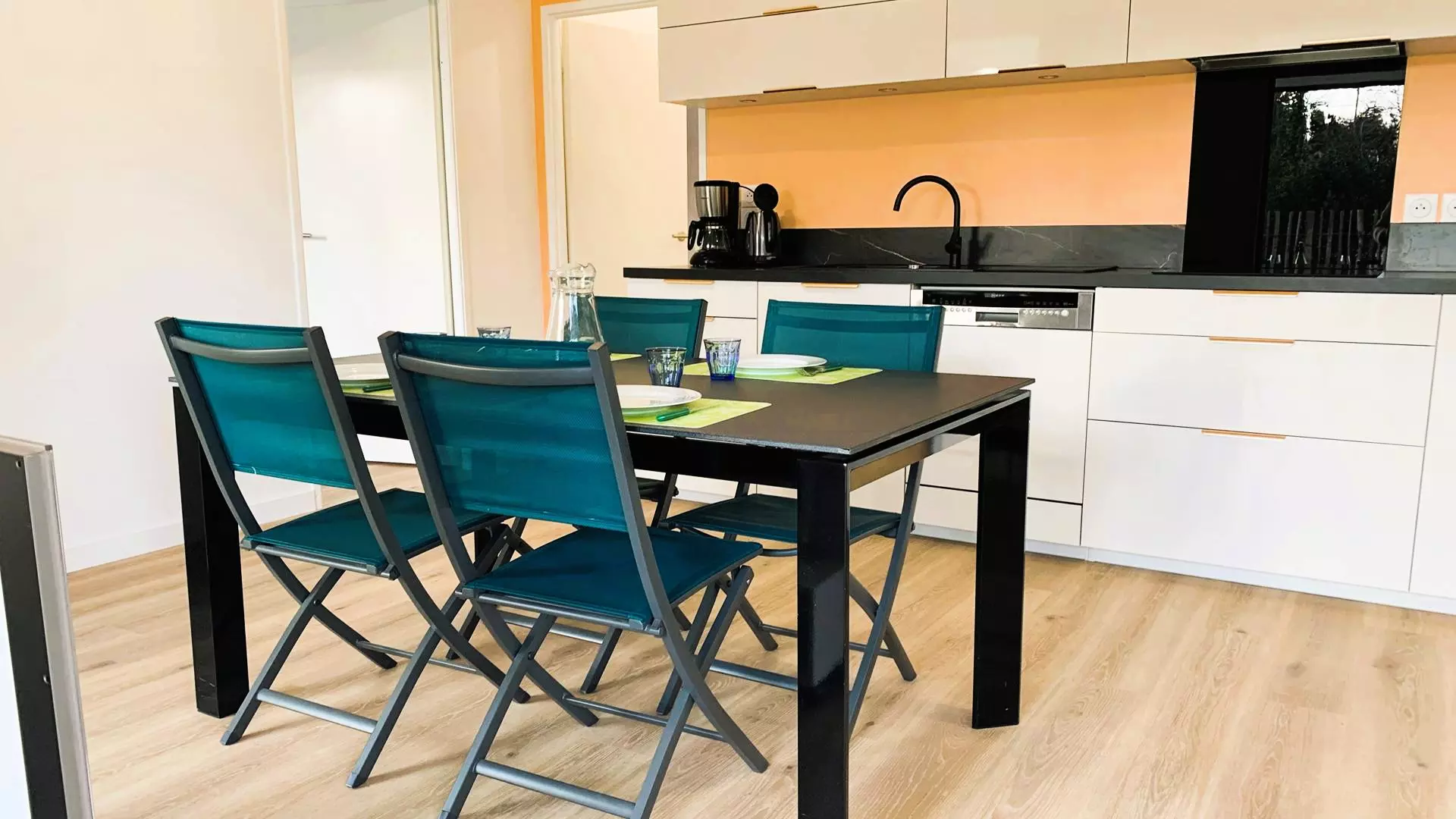 - Grande cuisine ouverte et toute équipée (plaque induction 4 feux, four, micro-ondes, réfrigérateur-congélateur, lave-vaisselle, cafetière, grille-pain, bouilloire)