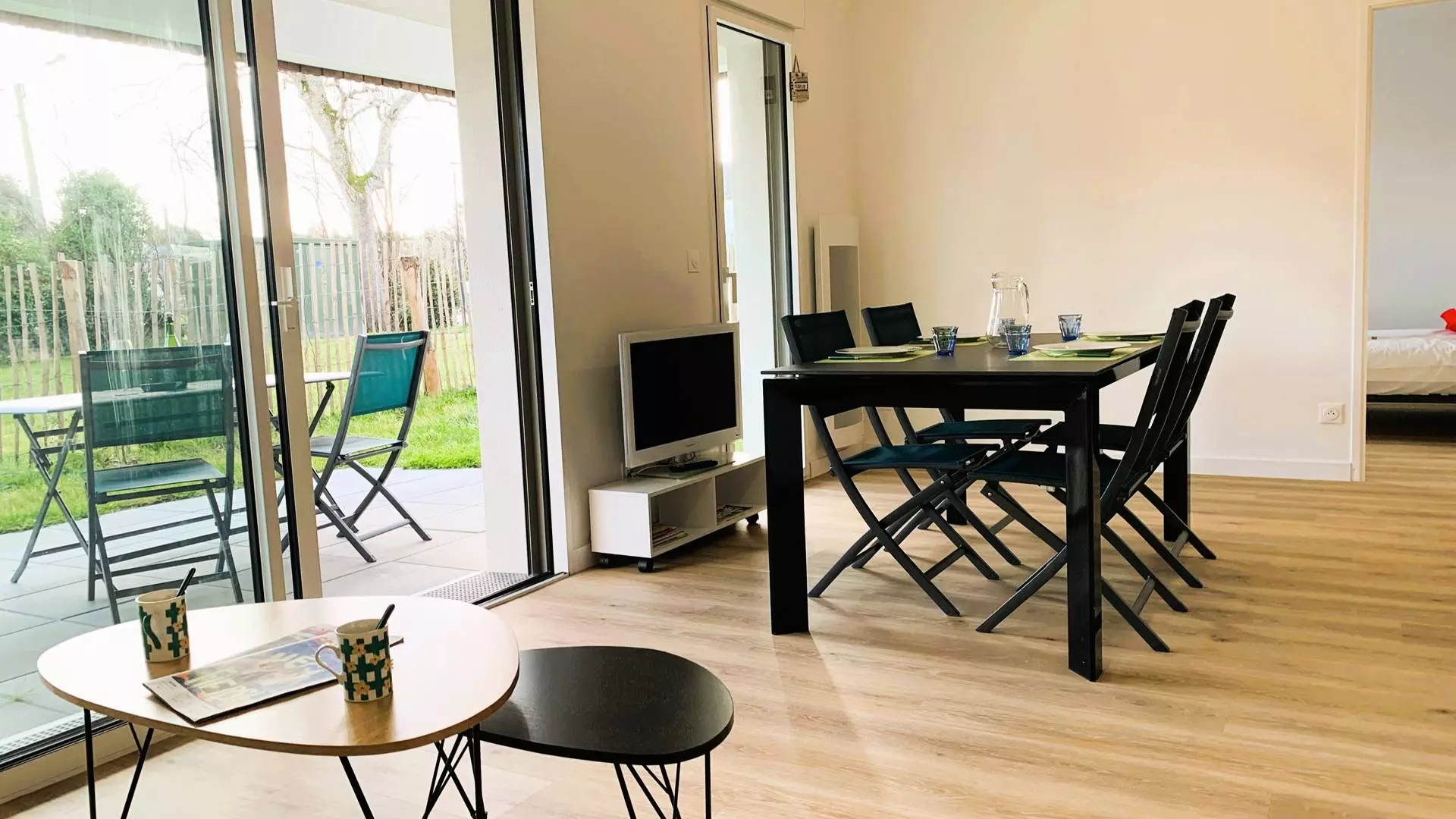 - Séjour avec partie repas (table et chaises) et partie salon (canapé, TV) ouvrant sur la terrasse partiellement couverte exposée Sud (meuble de jardin) et prolongée par le jardinet privatif clos