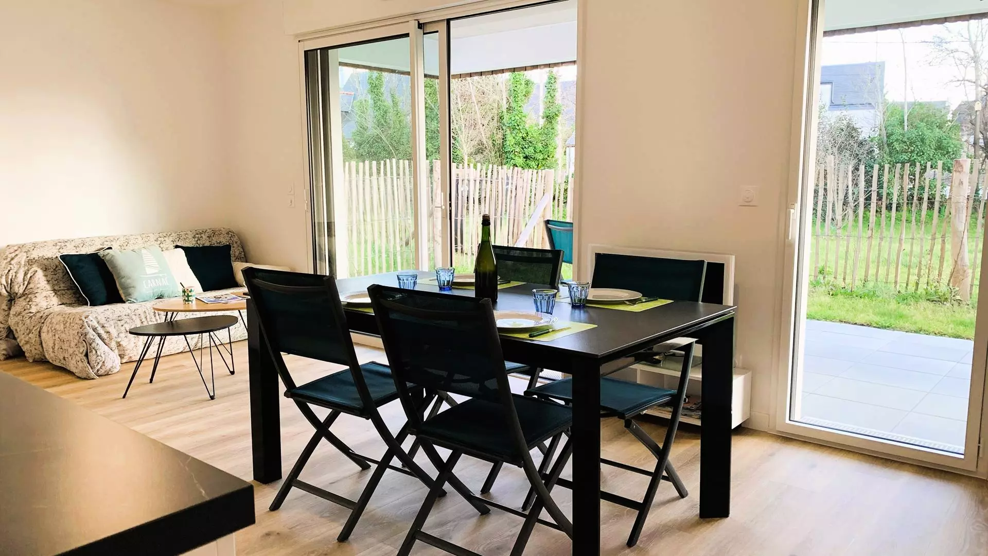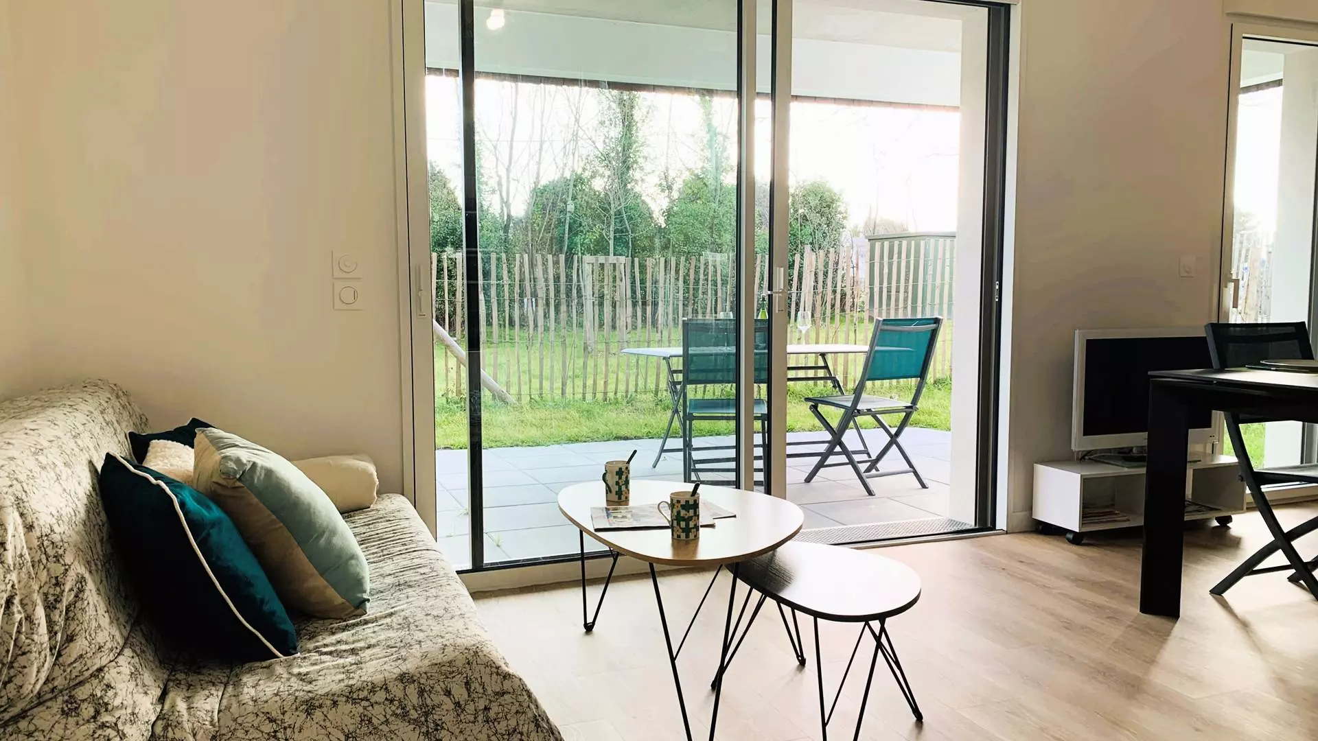 - Séjour avec partie salon (canapé, TV) et partie repas (table et chaises) ouvrant sur la terrasse partiellement couverte exposée Sud (table de jardin, chaises longues) et prolongée par le jardinet privatif clos
