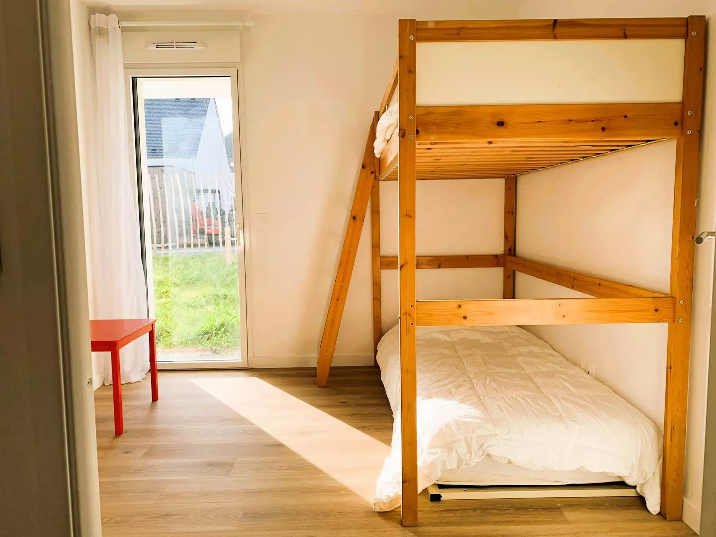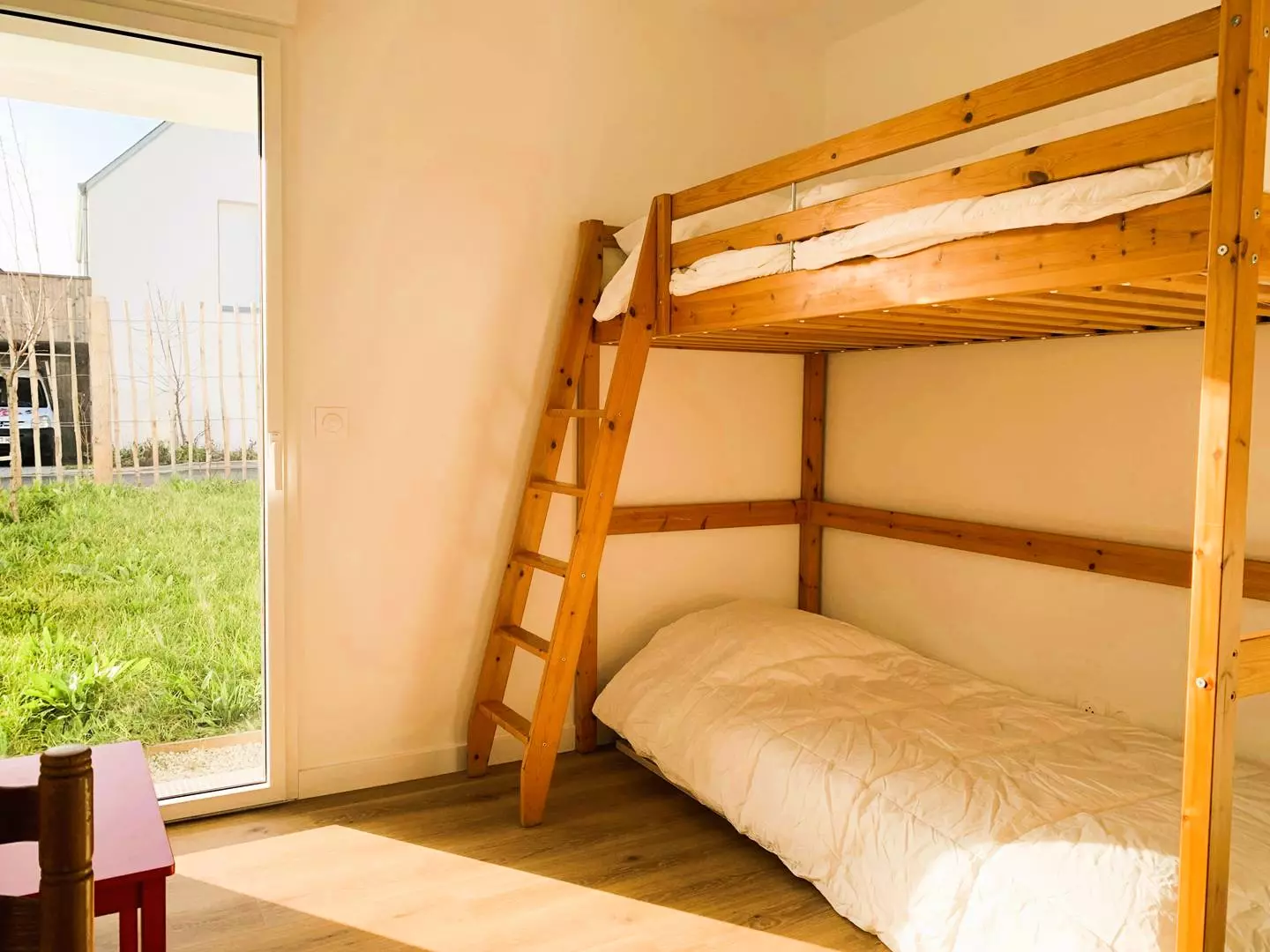 - 1 chambre avec lits superposés (90, couettes) avec accès au jardin