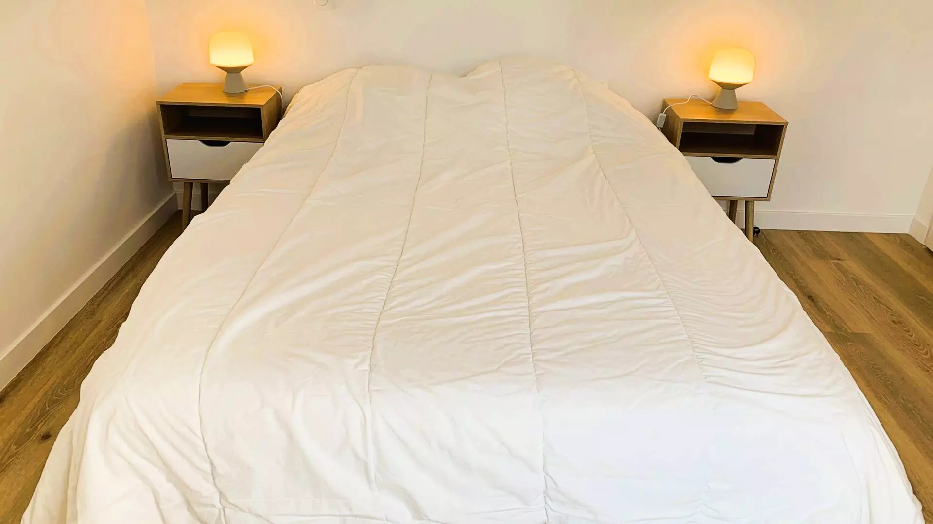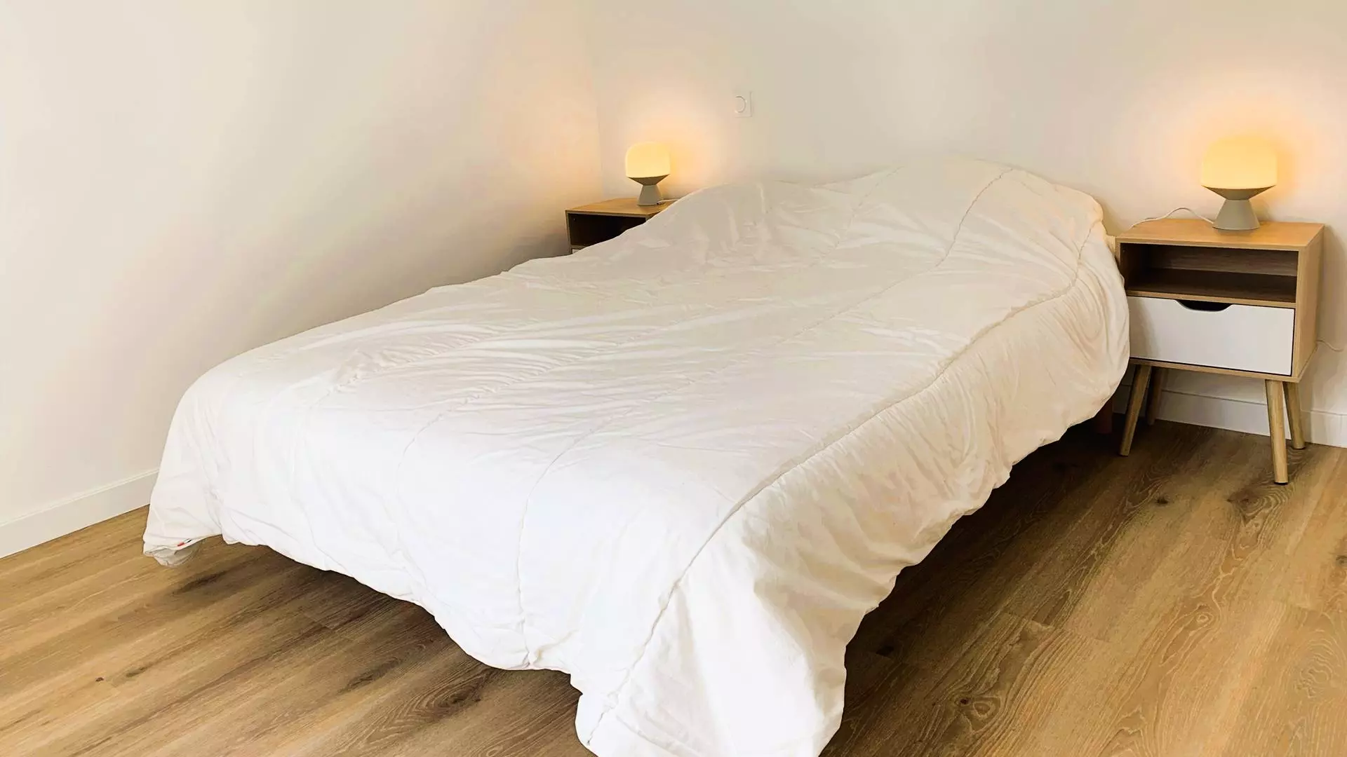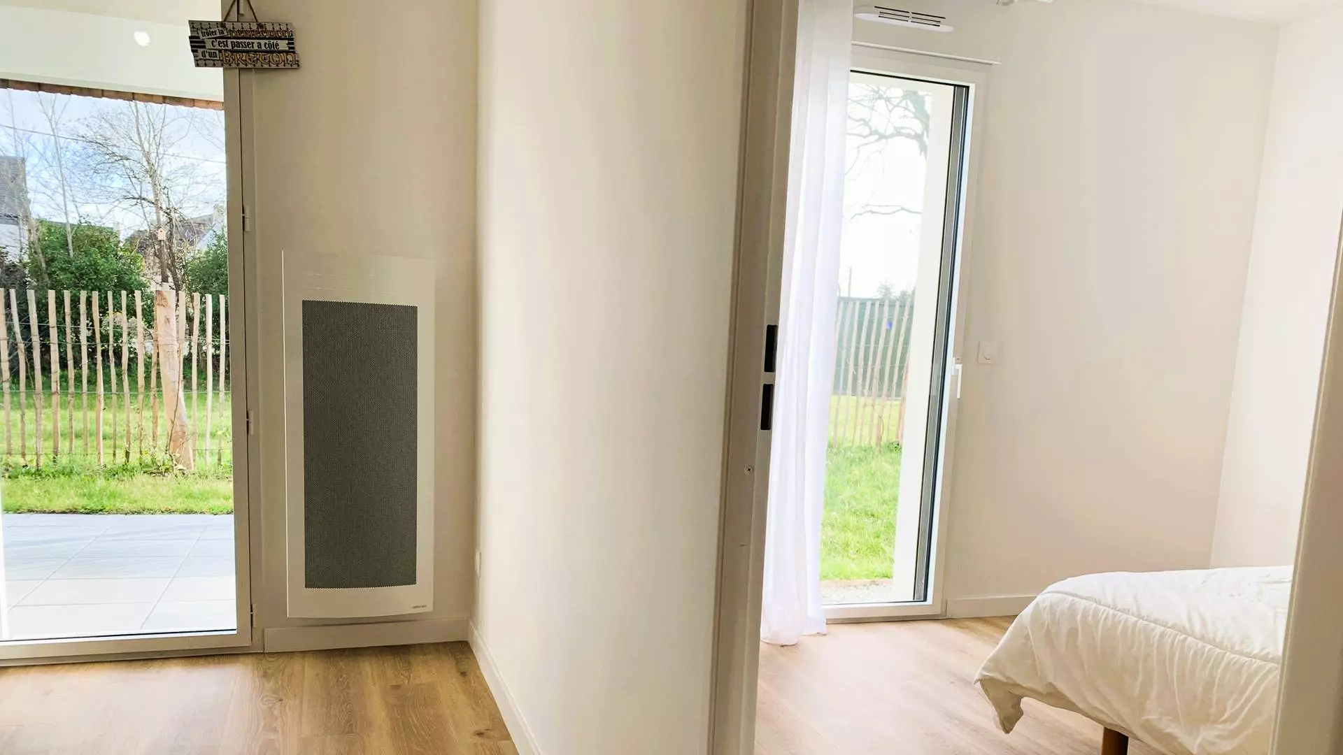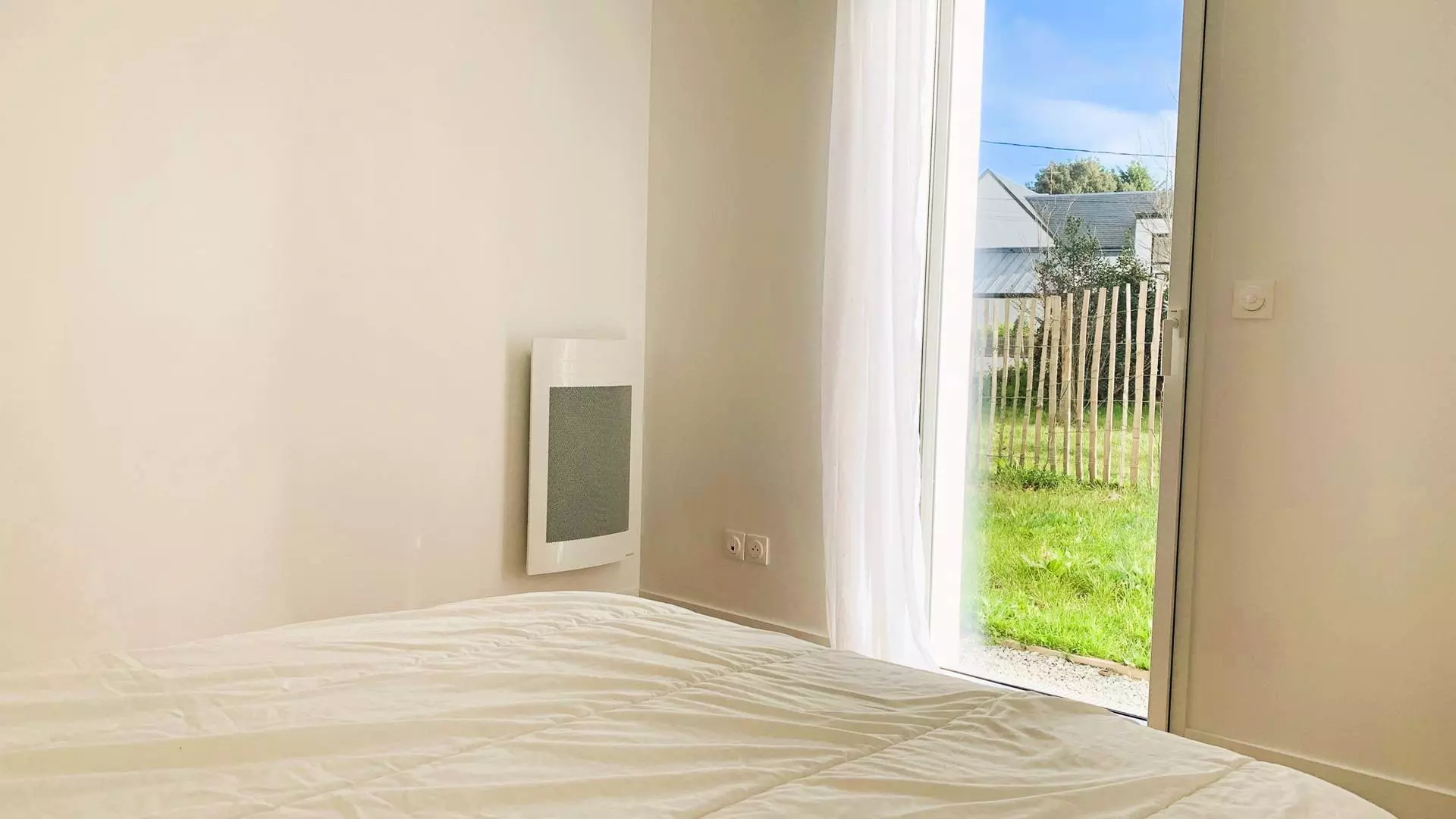 - 1 chambre avec 1 lit double (140, couette) avec rangements et accès au jardin