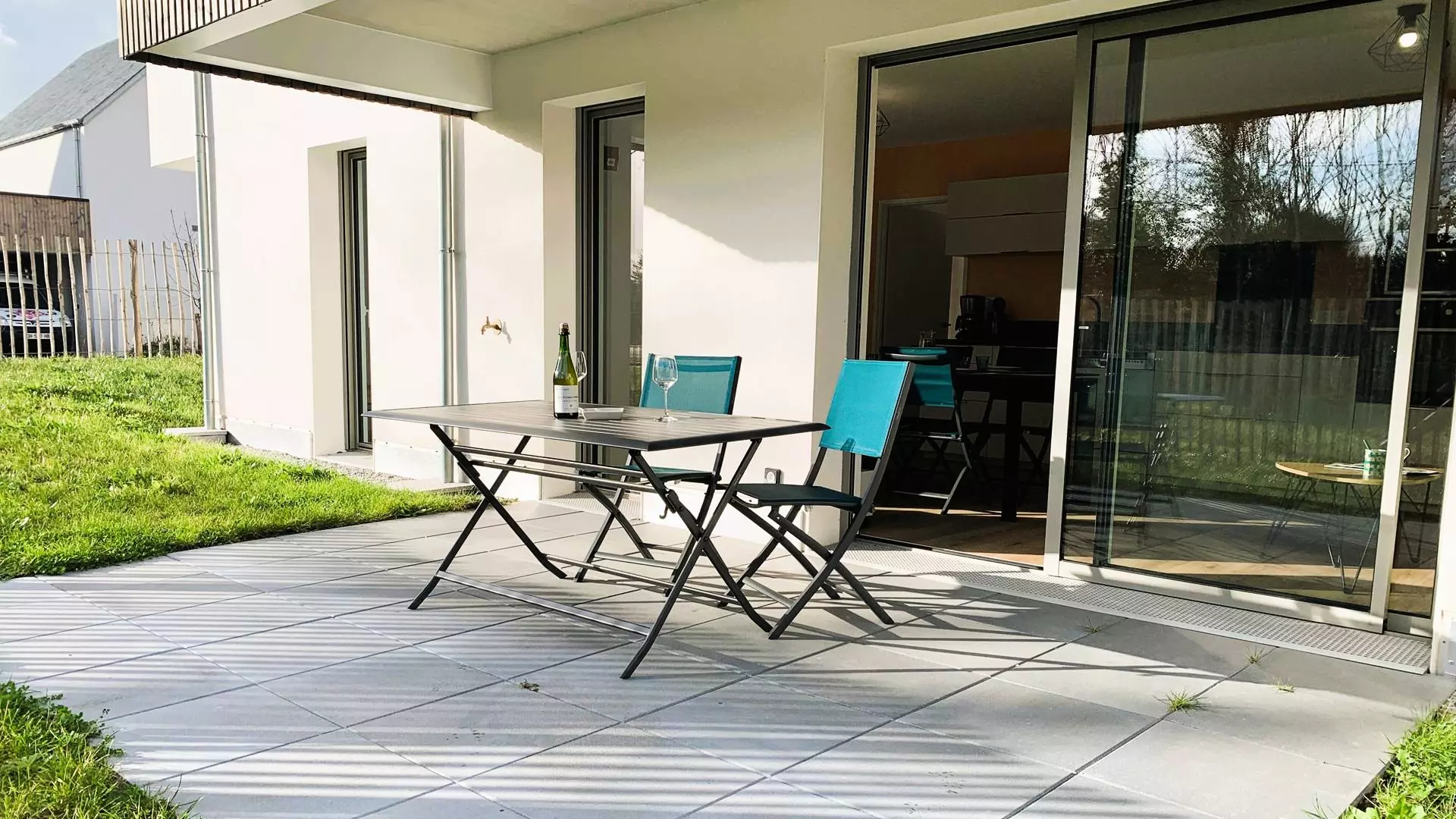 Idéalement situé à mi-chemin entre la plage et le bourg de Carnac, bel appartement 3 pièces pour 4 personnes (env. 58m²), avec grande terrasse et jardin privatif, situé dans la résidence moderne PASSAGE CESARINE (bâtiment A, RDC, porte 4) :