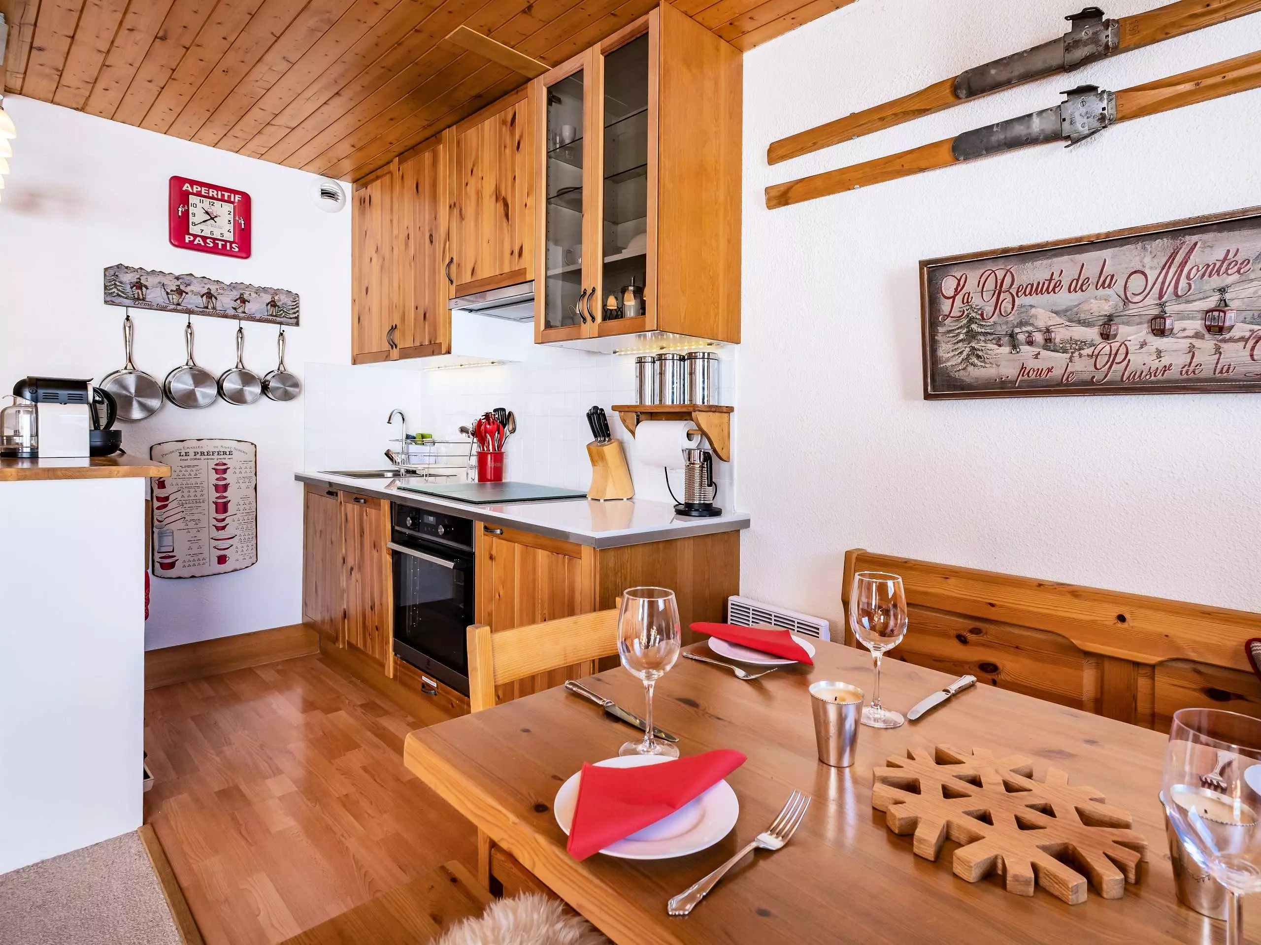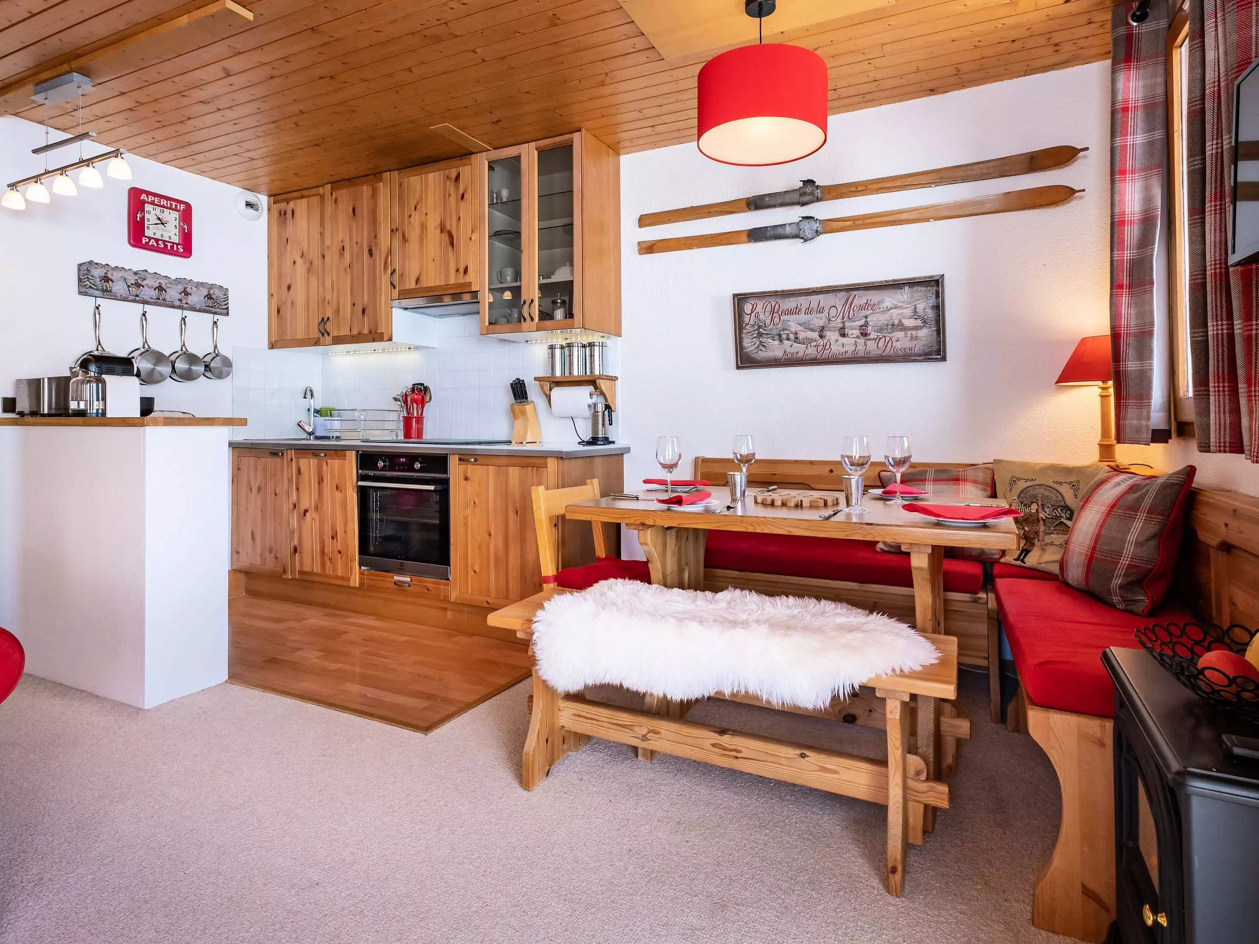 Le séjour contient un canapé convertible (140x190), la télévision. Coin montagne avec un ensemble de lits superposés (80x200). La kitchenette est équipée de plaques vitrocéramique, four, micro ondes, lave vaisselle, réfrigérateur, grille-pain, bouilloire, cafetière et hotte aspirante. Salle de bains avec sèche serviettes, wc séparés. Balcon, casier à ski et ascenseur dans la résidence. Animaux non admis. Appartement non fumeur. Etage -1. Départ skis aux pieds
