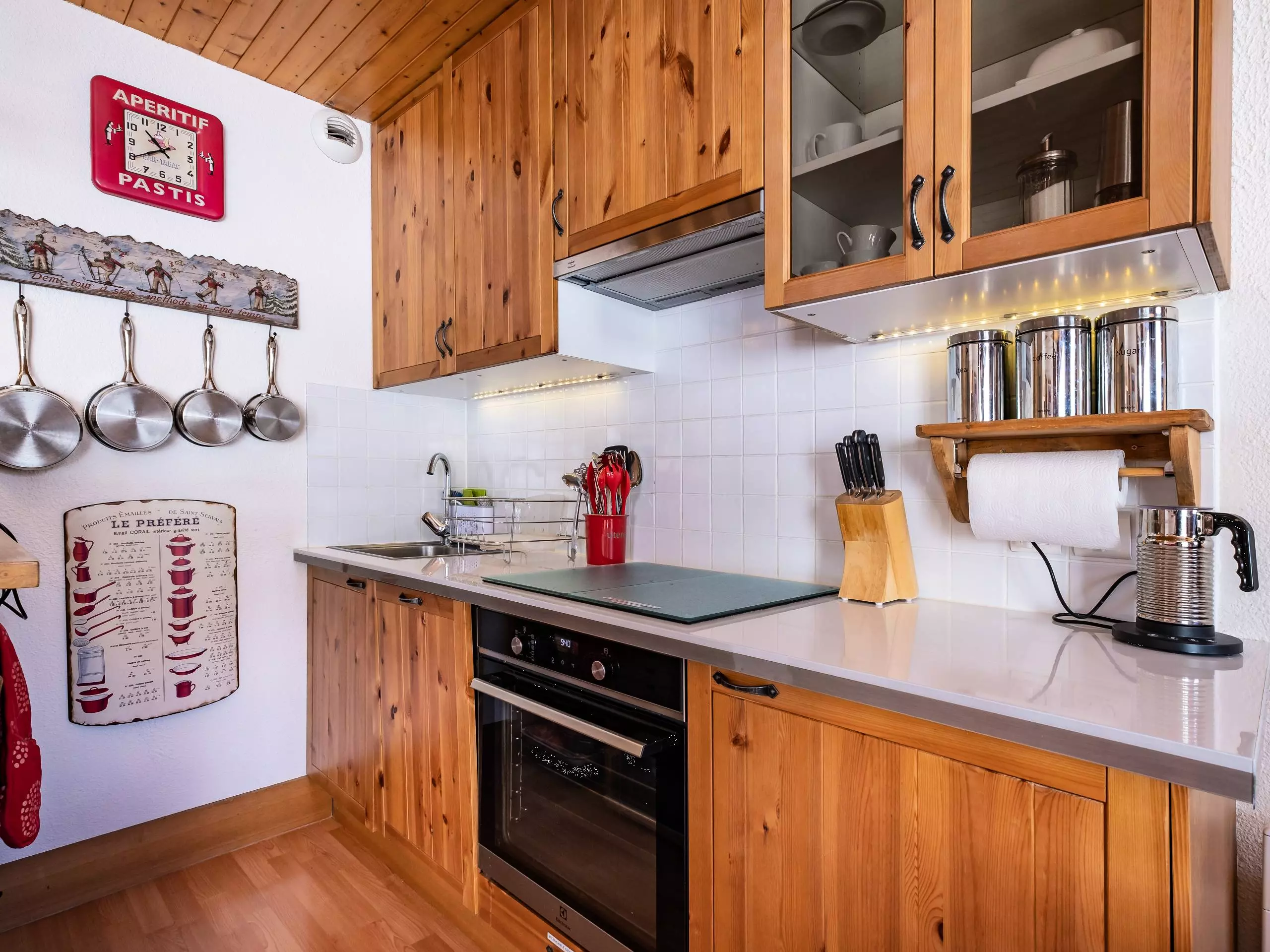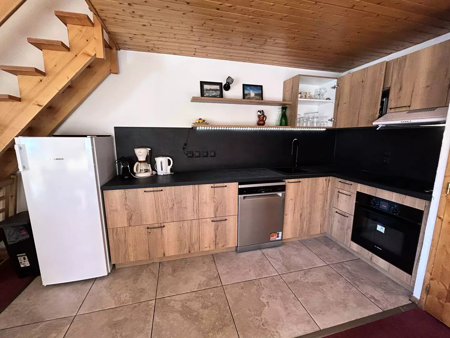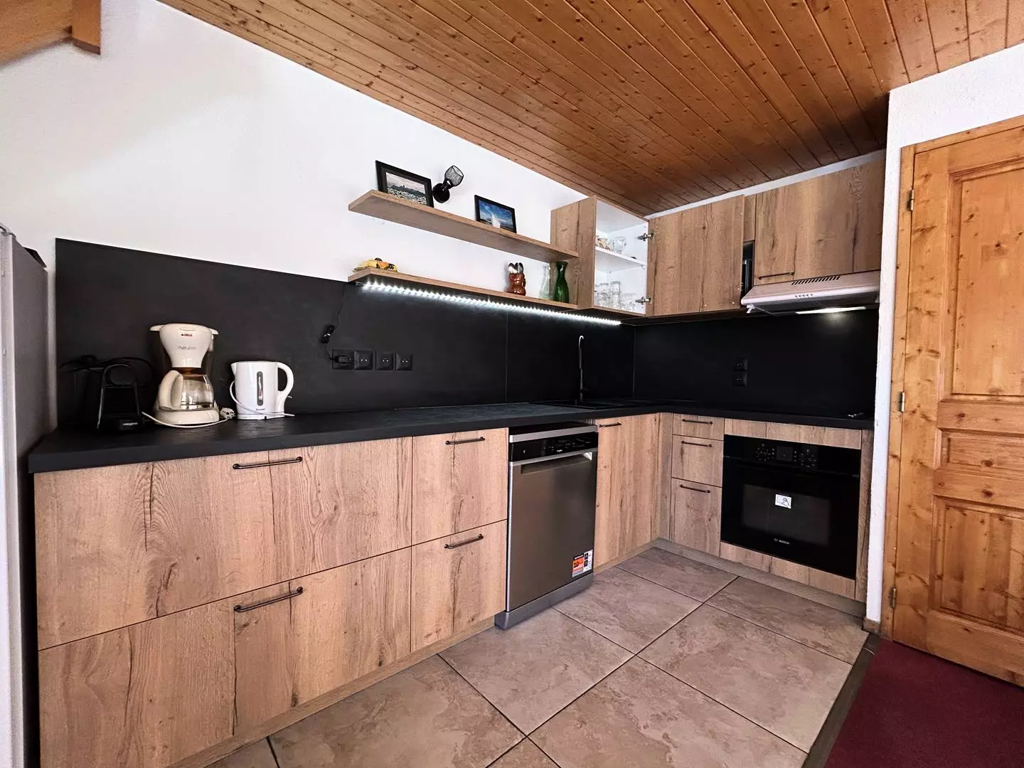 Le séjour se compose d'un canapé convertible pour 2 personnes. La cuisine ouverte est équipée d'un mini lave vaisselle, de plaques électriques, d'une cafetière Nespresso et d'un four.