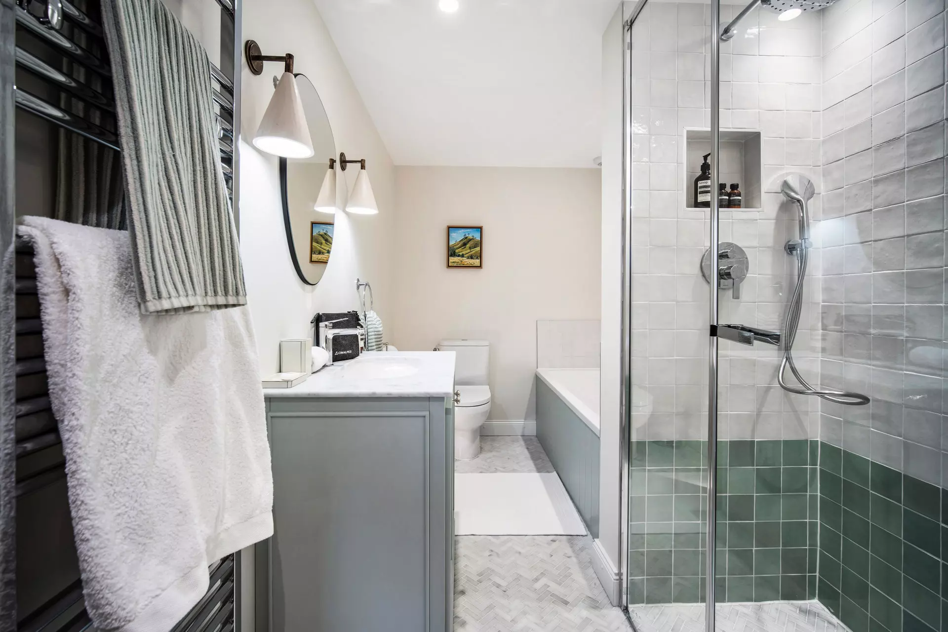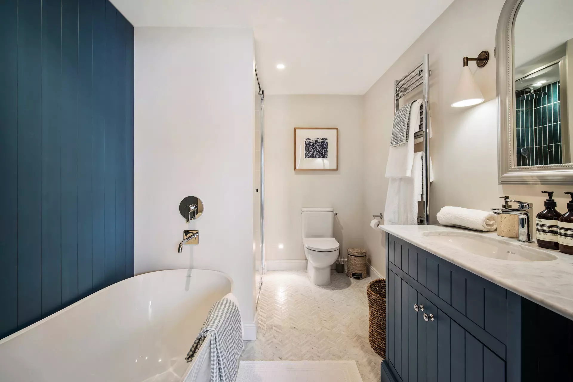 - 1 chambre master en suite (accès balcon) avec douche et baignoire et toilette