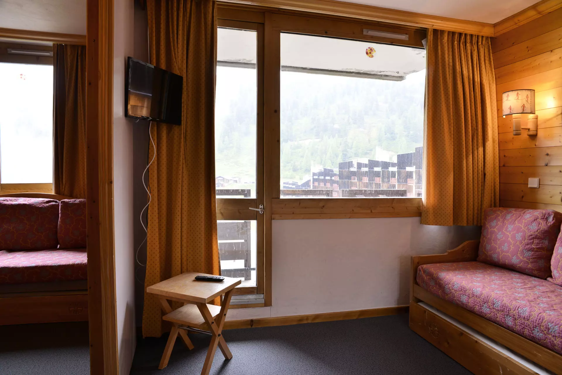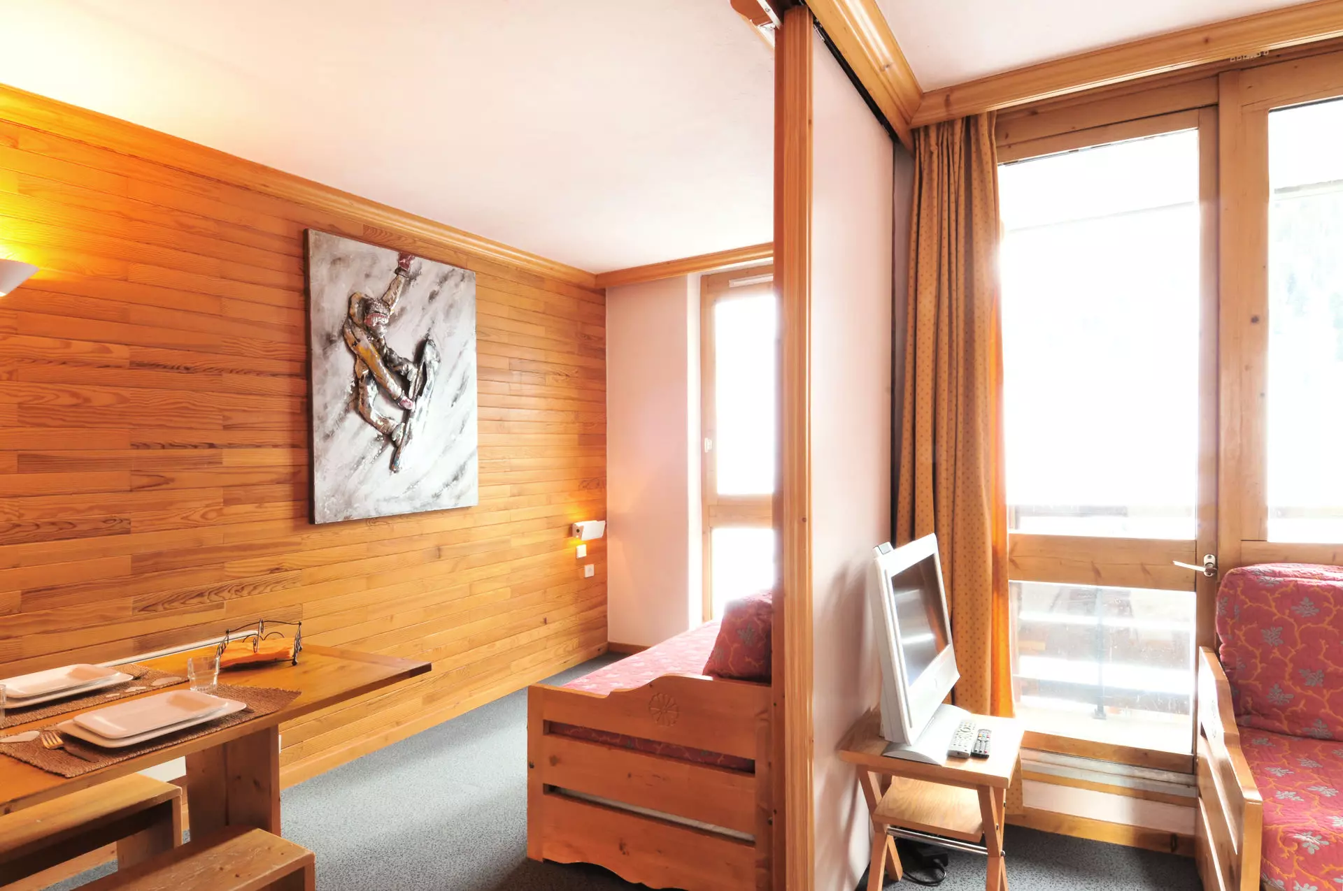 Séjour divisible : 2 lits banquettes 1 personne et 2 lits gigognes, 1 téléviseur écran plat