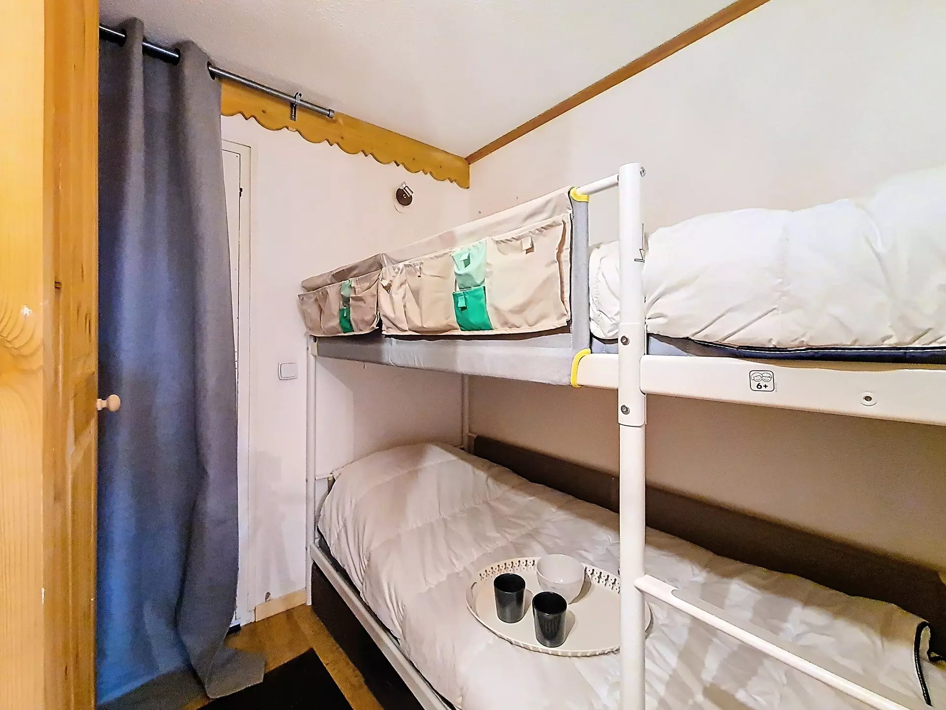 Cabine séparée par un rideau: 2 lits simples superposés (2x90cm).