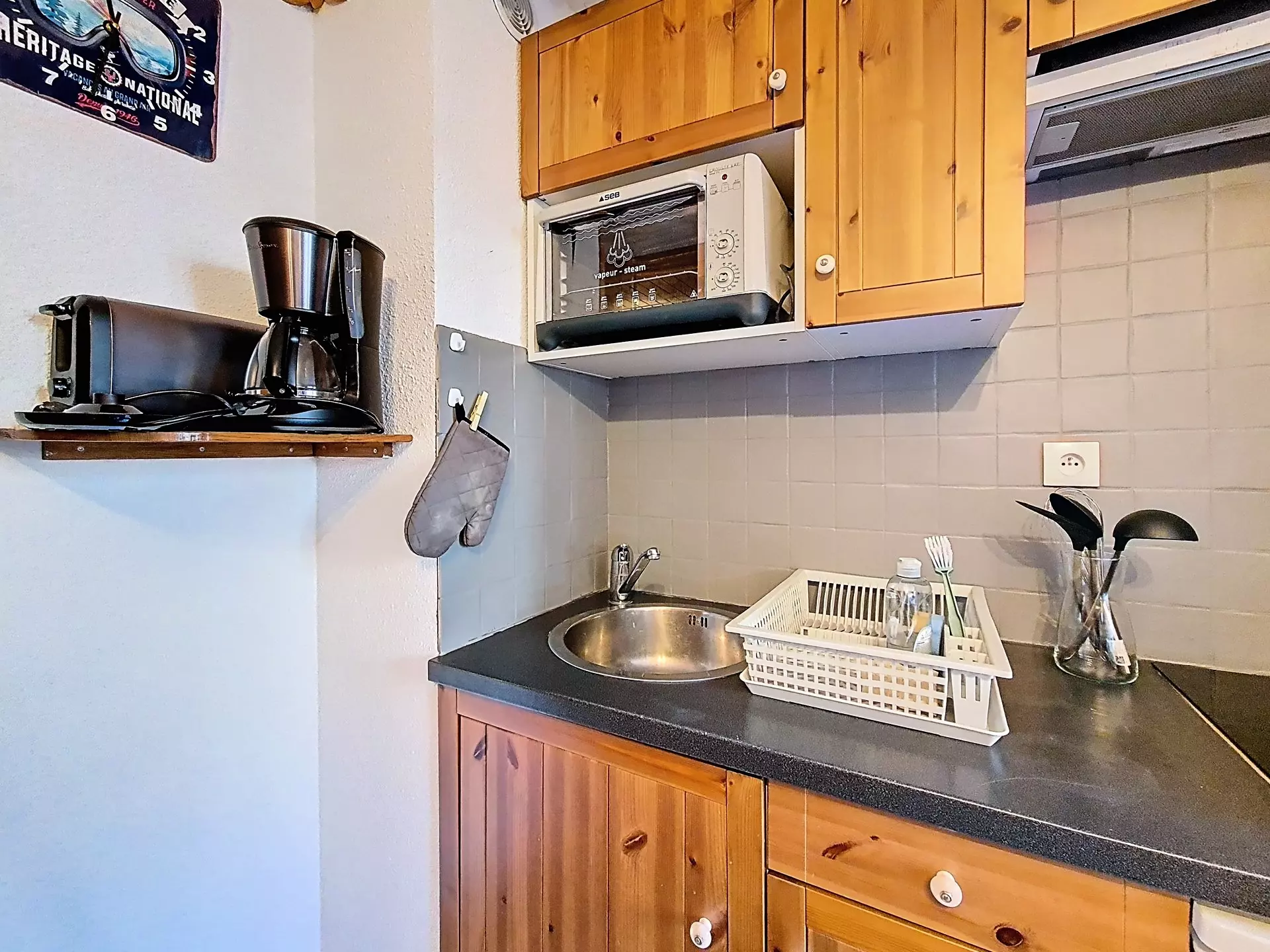 Cuisine équipée : réfrigérateur, mini four traditionnel, lave-vaisselle, cafetière et grille-pain.