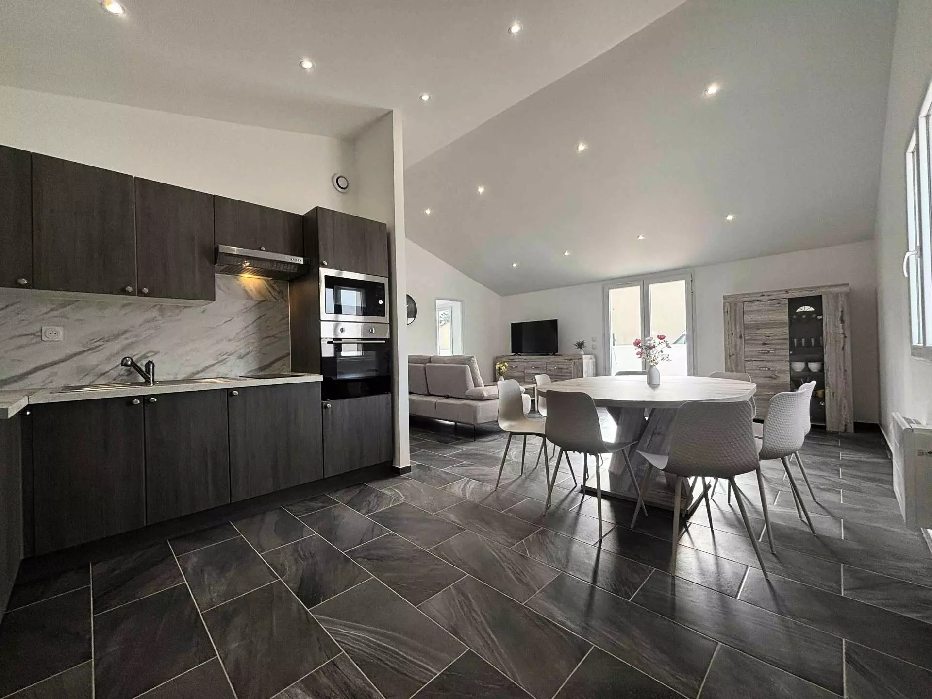 Le logement : Belle maison neuve, décorée avec goût à deux pas de la plage se composant d'une pièce de vie agréable et lumineuse avec cuisine ouverte aménagée et équipée ( réfrigérateur et sa partie congélateur, micro-ondes, four électrique, bouilloire, cafetière), d'une première chambre avec un lit deux couchages (140), d'une deuxième chambre avec un lit deux couchages (140),et d'une troisième chambre deux couchages (140), d'une salle d'eau avec douche et WC. A l'extérieur, une terrasse en bois avec mobilier de jardin.