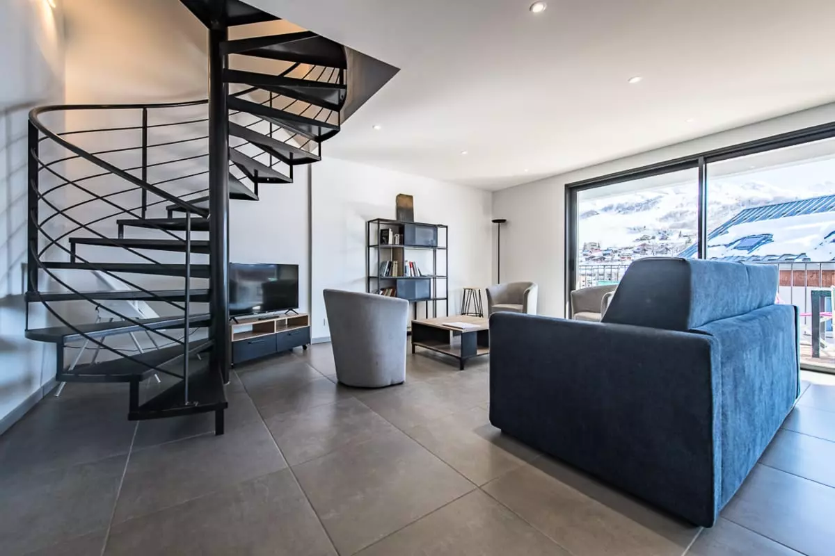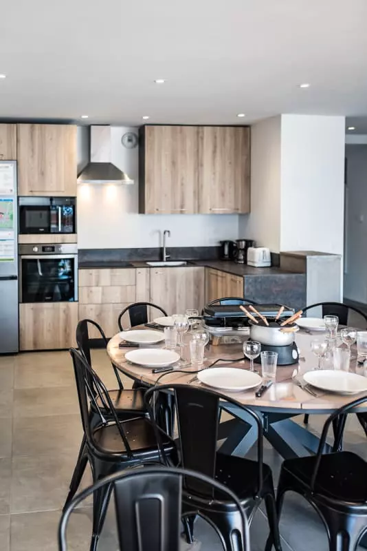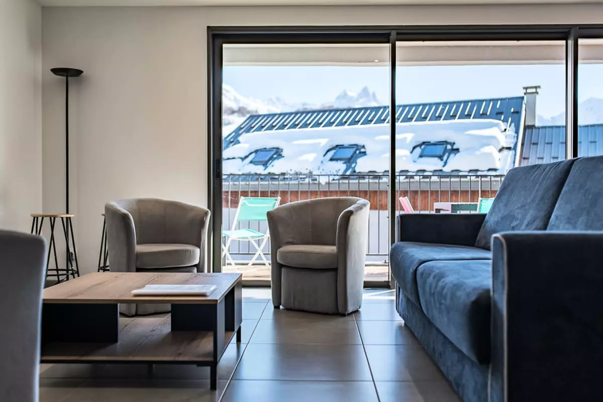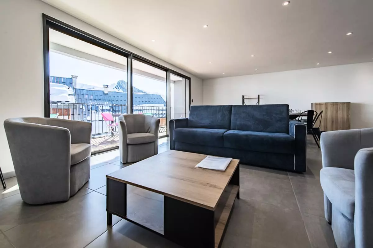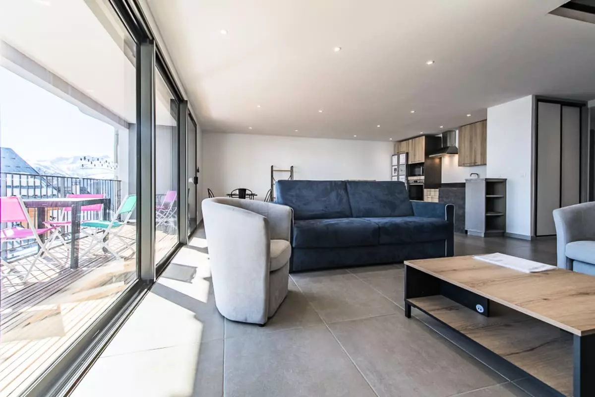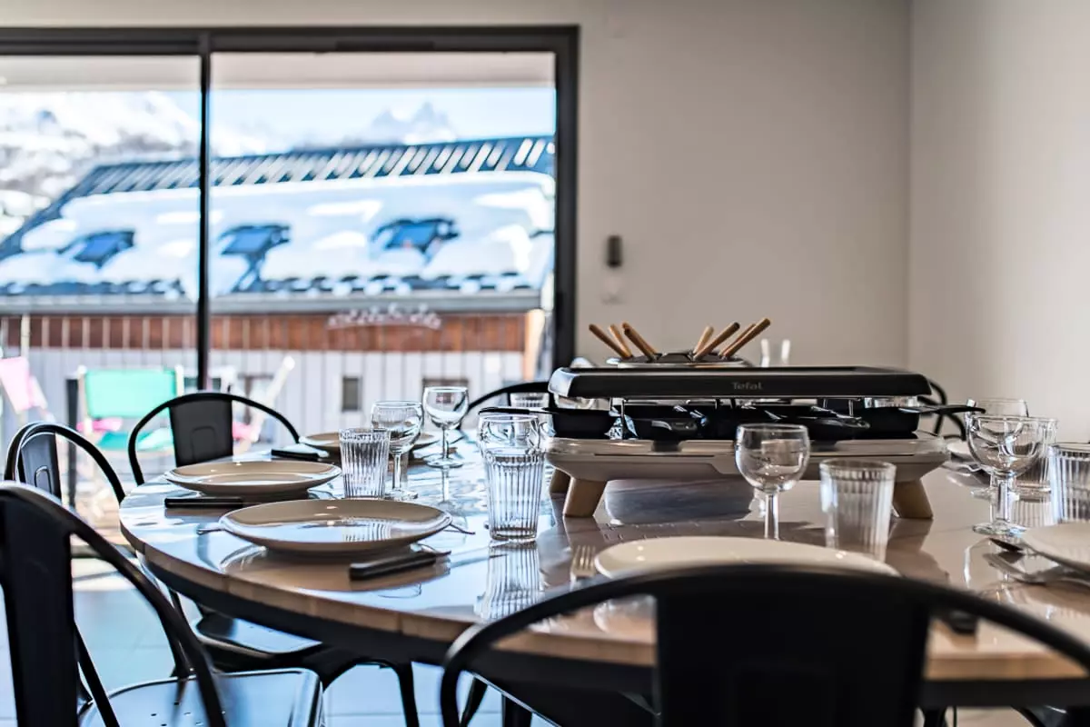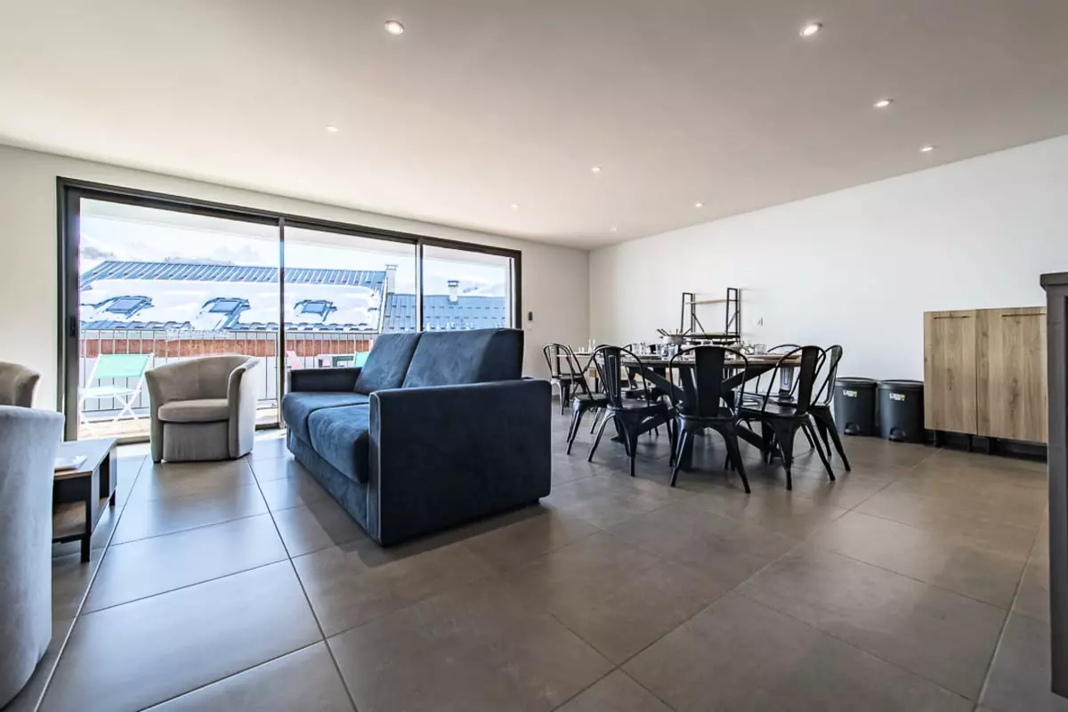 Le salon lumineux s'ouvre sur une terrasse de 12 m² offrant une vue imprenable sur les pistes de ski et les montagnes environnantes. Il est équipé d’un canapé-lit confortable (160 x 200 cm), d'une télévision et d’un espace repas convivial. La cuisine ouverte, entièrement équipée, comprend un four, une machine à café (filtre) et tout le nécessaire pour préparer de délicieux repas.