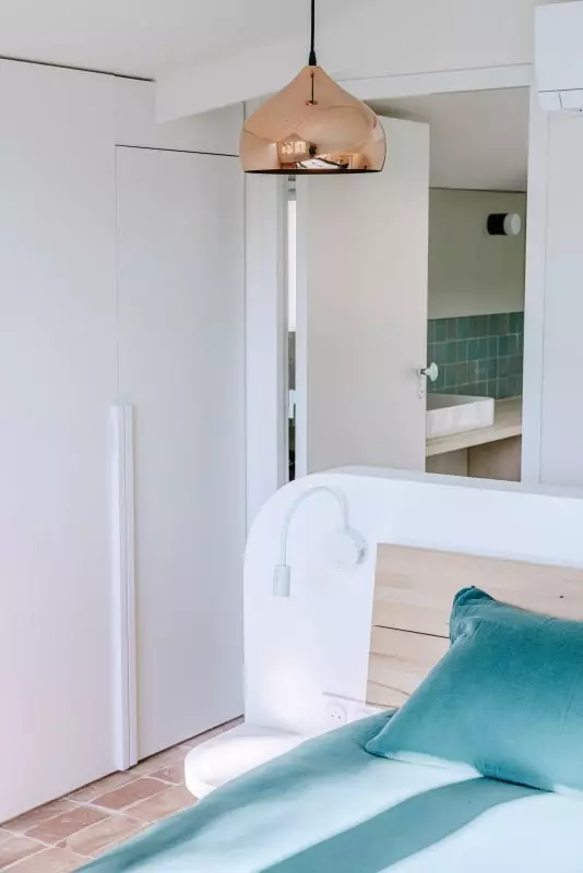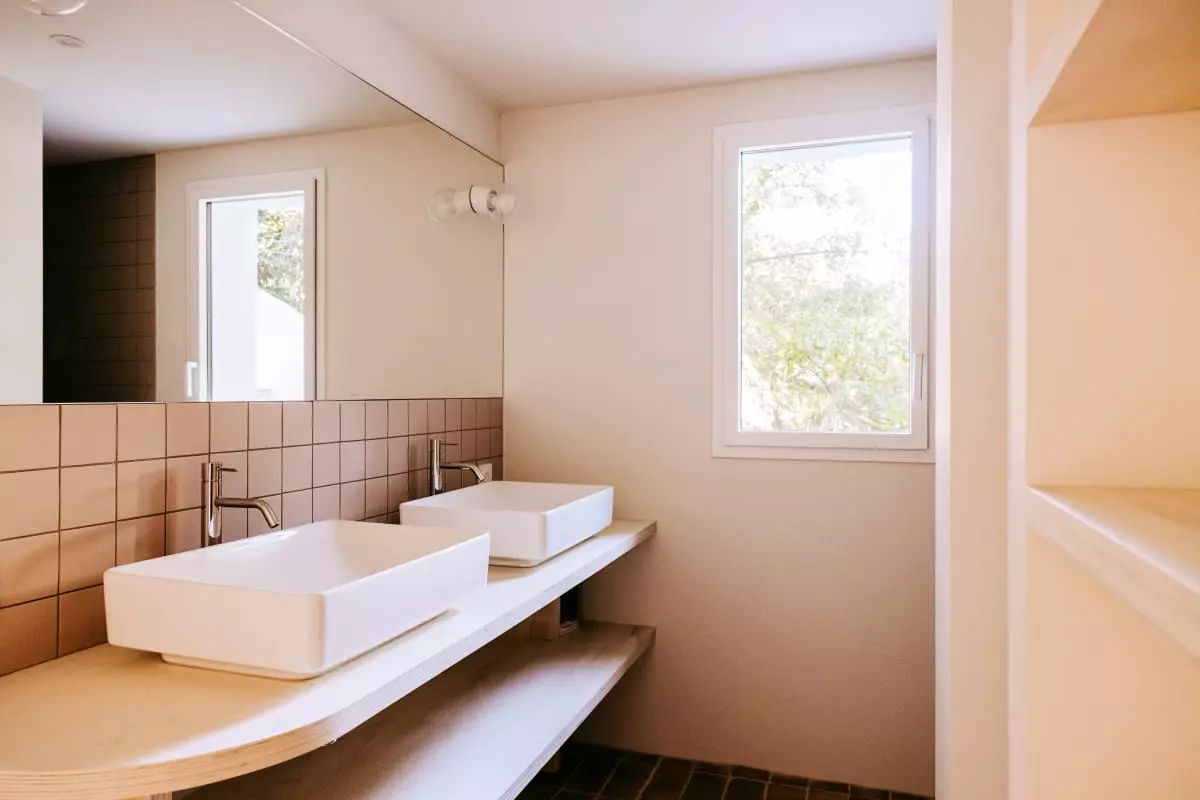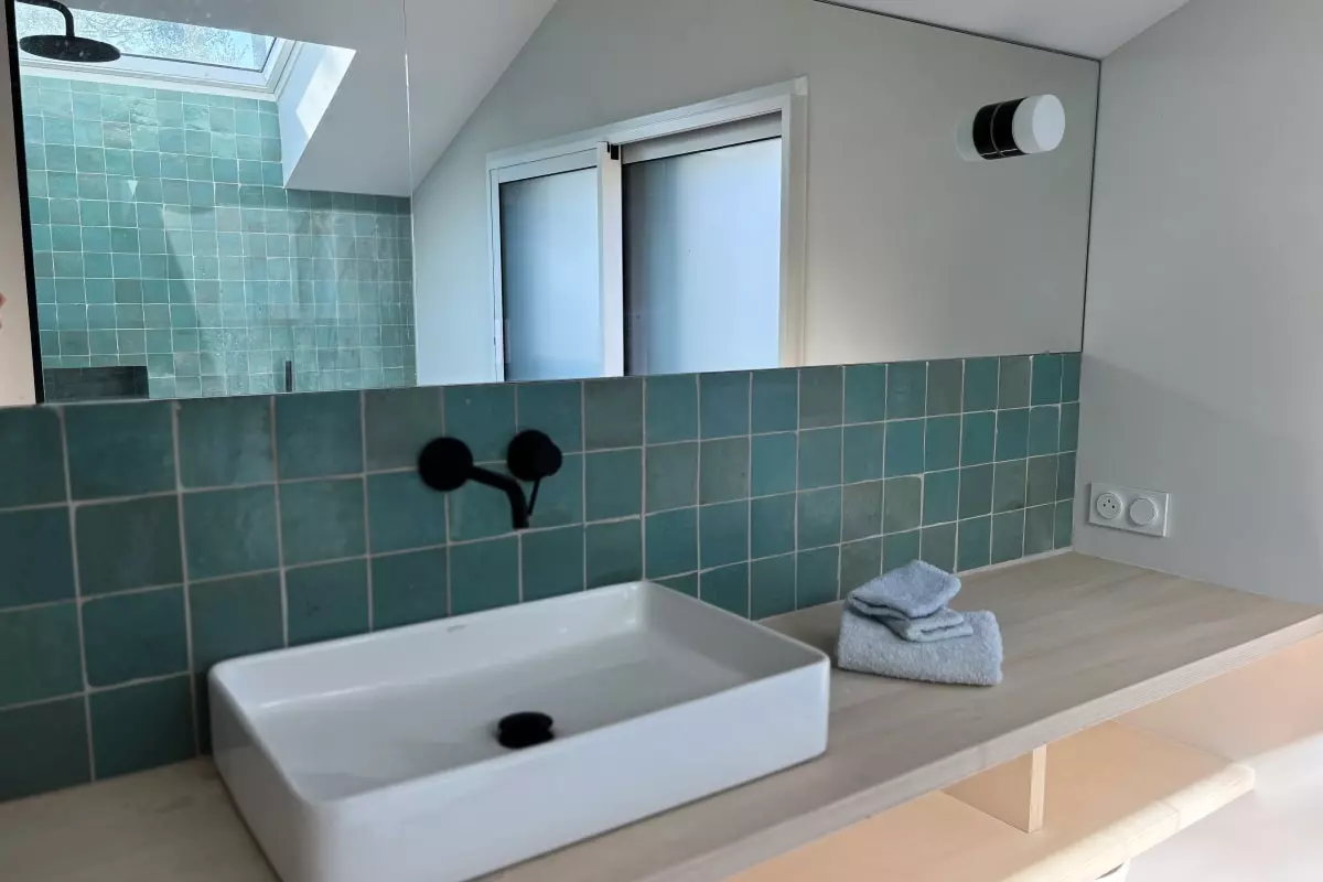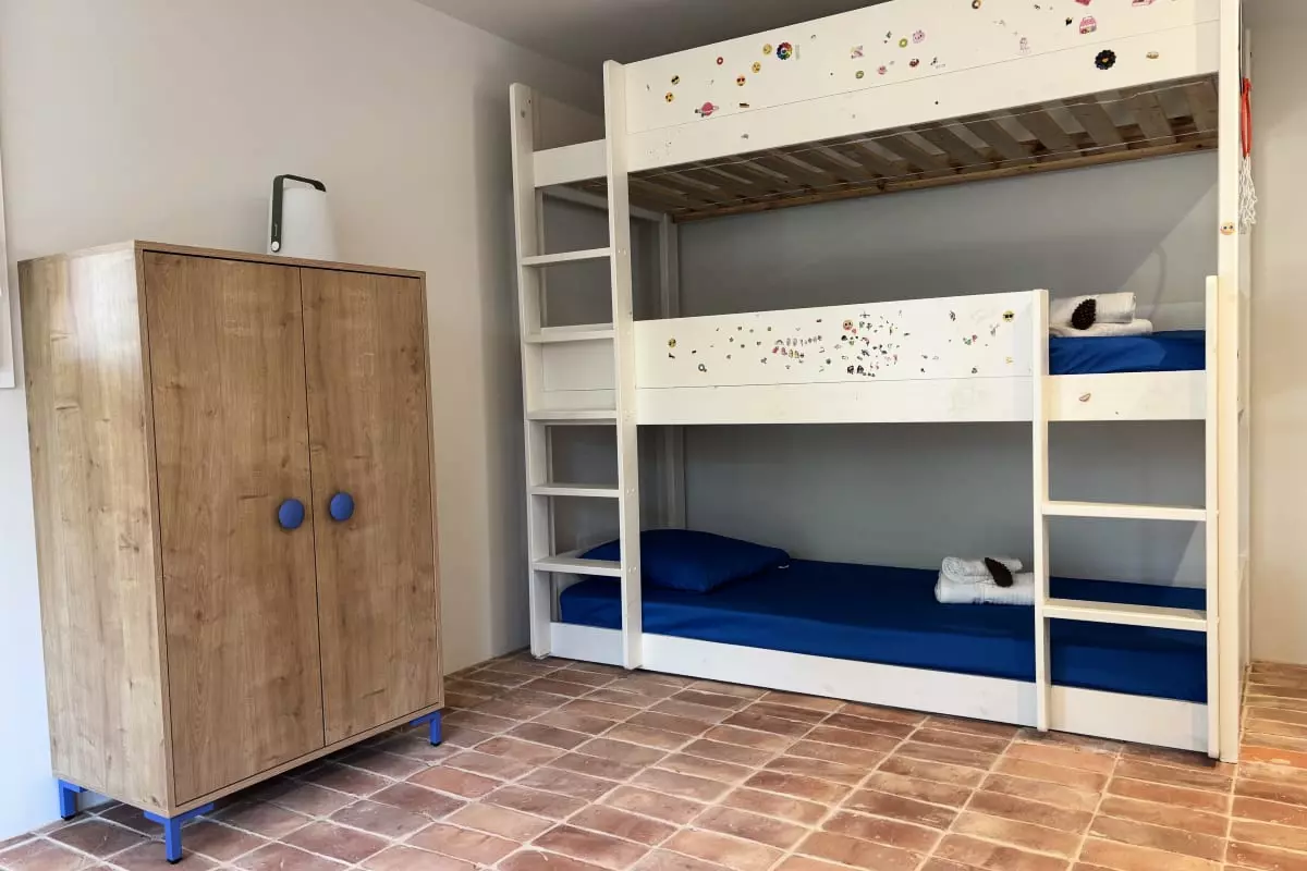 Vous trouverez 2 suite parentales vous offrant une intimité et un confort optimal. Au rez de chaussée se trouve 1 chambre pour adulte ou enfant, avec 2 lits simples pouvant être mis en lit double (160x200) , 1 chambre dortoir et une salle de douche avec un meuble double vasque, dans un esprit brut-chic qui résume l’atmosphère de la villa.