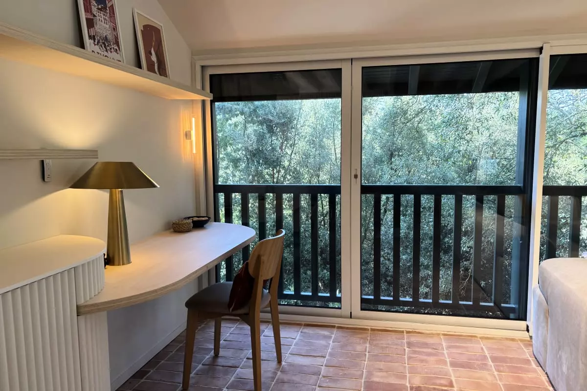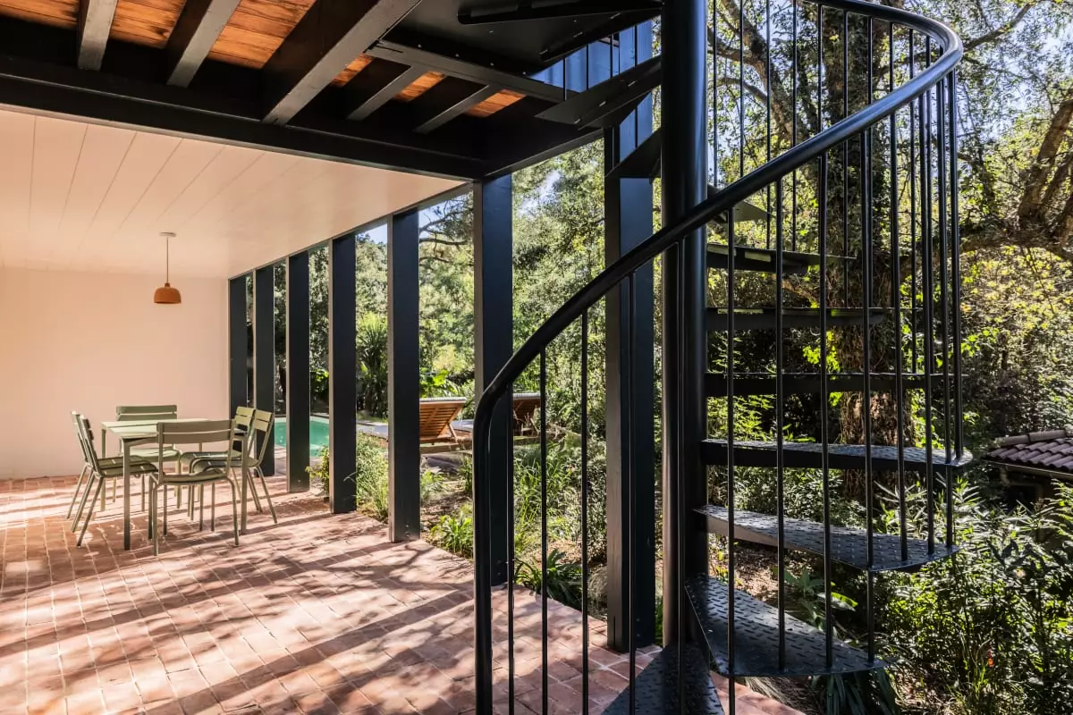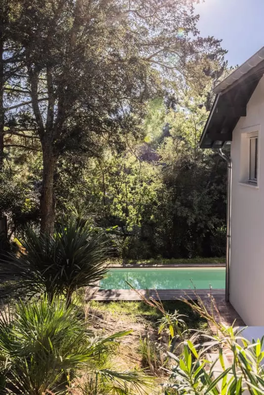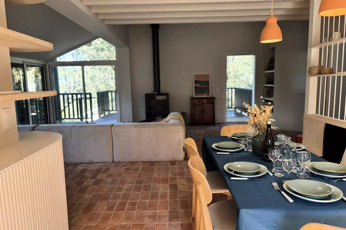 La pièce à vivre se compose d'un salon, d'une salle à manger avec banquette pour plus de convivialité et d'une cuisine au couleurs douces et clairs. Vous accéderez depuis ce niveau à une terrasse nichée dans les arbres afin de vous réunir autour d'un verre pendant les longues soirées d’été. Une seconde terrasse plus intimiste avec un coin repas disposant d'une plancha et au bord de la piscine vous permettra de partager de beaux moments de convivialité.