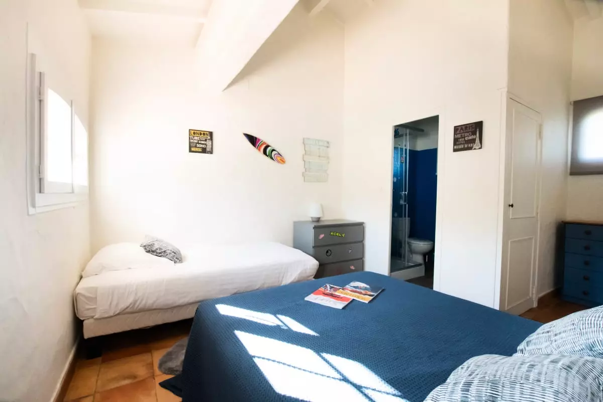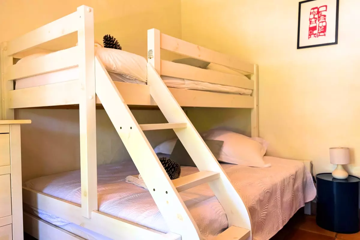 La pièce à vivre se compose d'un grand salon avec cheminée et bar, d'une salle à manger conviviale et d'une cuisine authentique tout équipée. Vous trouverez, à l'écart, une salle télé. Poursuivez votre visite dans l'espace nuit, composé de 3 chambres, deux avec lits double, dont une suite parentale et une chambre avec un lit double mezzanine partageant une grande salle de douche. A l'étage une chambre avec un lit double et un lit simple, type dortoir, avec une salle de douche privative.