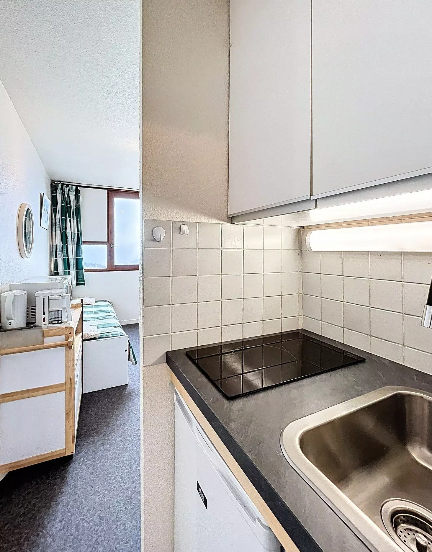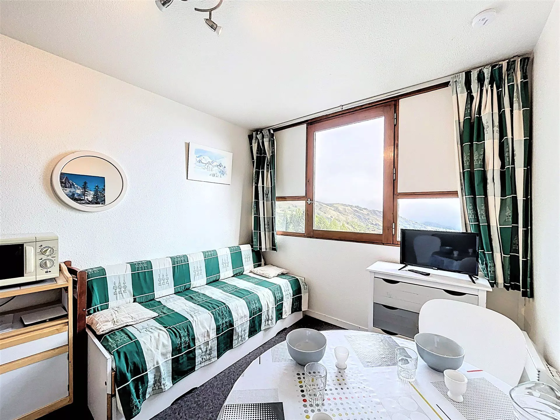Un séjour/salle à manger agréable qui donne sur un balcon vue pistes, est équipé d'1 canapé double en 140 et d'1 lit simple en 90 ainsi que d'une télévision à écran plat et ouvrant sur un coin cuisine moderne, équipé de 2 plaques vitro, 1 mini-four, 1 lave-vaisselle, 1 grille-pain, bouilloire électrique, micro-ondes et cafetière filtre. Le studio est également doté d'une alcôve séparée par des rideaux avec 2 lits 1 personne superposés en 80x190.