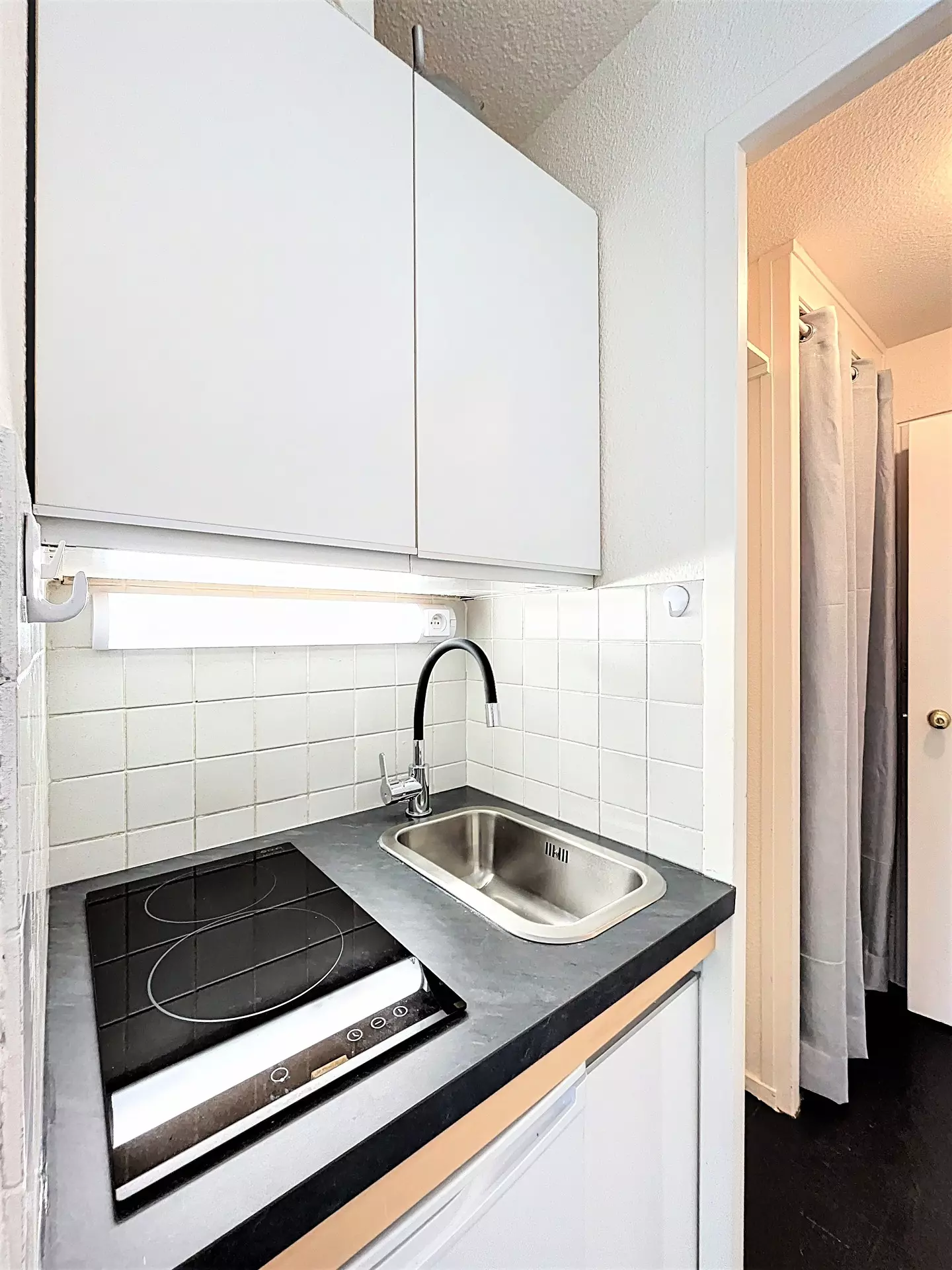 Ce studio comprend une entrée avec placard de rangement.Une salle d'eau équipée d'une douche, d'une vasque, d'un sèche-serviettes électrique et de toilettes. Un coin kitchenette équipé d'une hotte, d'une plaque électrique 1 feu, d'un réfrigérateur, d'un micro-ondes grill, d'une cafetière universelle à dosettes, d'une bouilloire, d'un grille-pain, ainsi que d'appareils à raclette et à fondue.