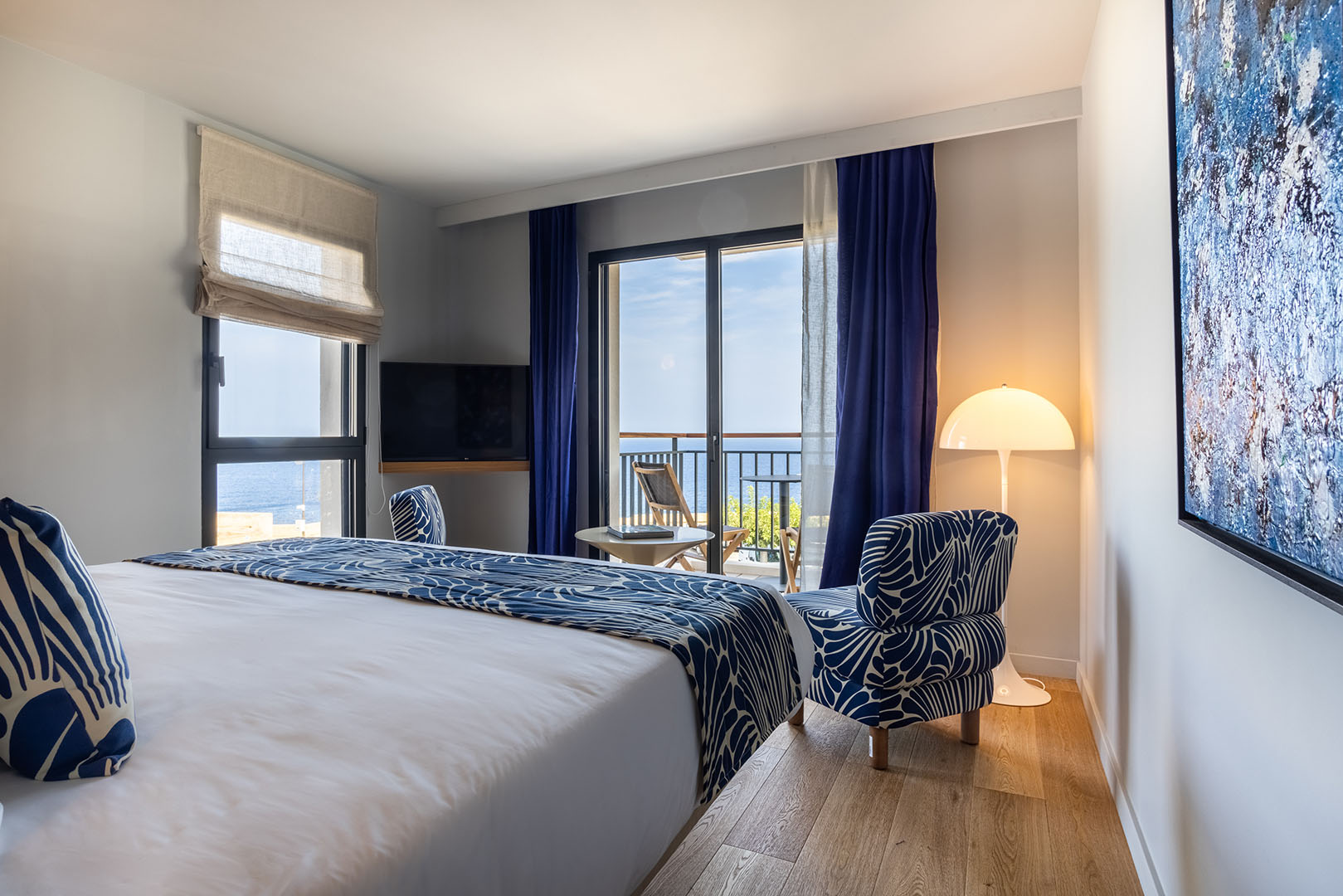 39 chambres climatisées, spacieuses et lumineuses, de différentes catégories dont les Classique (2 personnes, 23m²), avec balcon vue citadelle et piscine, les Supérieure (2 personnes + 1 bébé, 30m²), avec balcon vue mer de côté et piscine, les Deluxe (2 personnes + 1 enfant de 3 à 11 ans ou 1 bébé, 32m²), avec balcon vue mer et citadelle, les Suite Junior (2 adultes + 1 enfant de 3 à 11 ans ou 1 bébé, 35 m²) avec balcon ou terrasse vue piscine et mer de côté, les Suite Supérieure (2 adultes + 2 enfants de 3 à 11 ans ou 2 lits bébés,42m²) avec balcon ou terrasse vue piscine et mer de côté, Suite Prestige (2 adultes + 2 enfants de 3 à 12ans ou 2 lits bébés) avec terrasse vue mer et citadelle. Elles sont équipées de lit king size (180x200), dressing, télévision, minibar, coffre-fort, téléphone, machine à café Nespresso©, de salle de bain avec douche et sèche-cheveux, les WC étant séparés dans les catégories Supérieure et Deluxe, et d’un coin salon. Ascenseur.