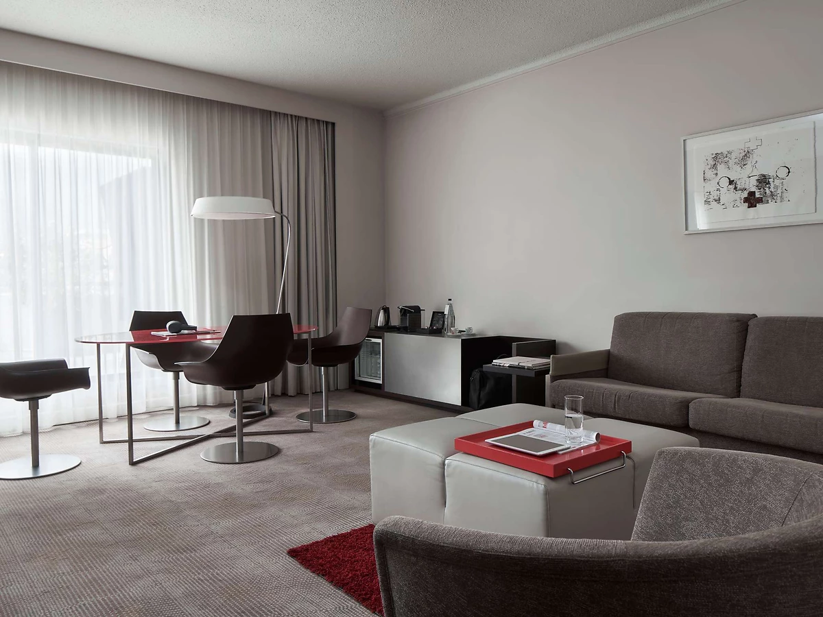 - Chambre Exécutive avec 1 lit double et un Sofa : Chambre de 21 m², pouvant accueillir 2 adultes et 2 enfants, avec vue côté cour ou côté ville. Produits et services VIP. Design et confort optimal.