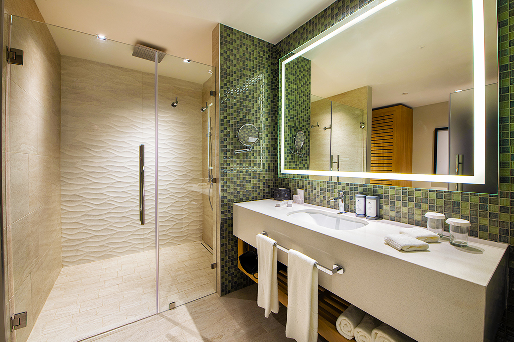 Cette belle suite de 43m² est décorée de couleurs douces : beige et vert lagon se côtoient au milieu de matières nobles et d’une belle literie blanche.