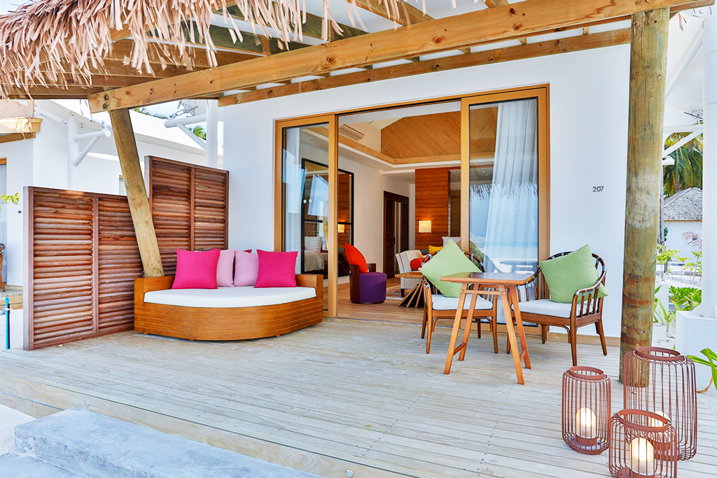Le Water Bungalow dispose des mêmes équipements que le Beach Bungalow avec terrasse avec hamac, sol en verre et accès direct au lagon.