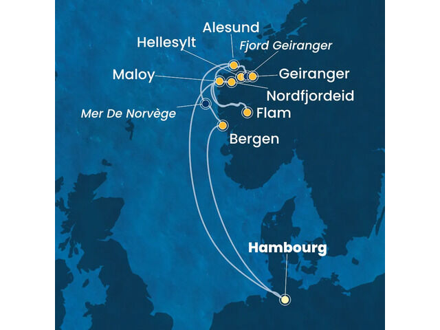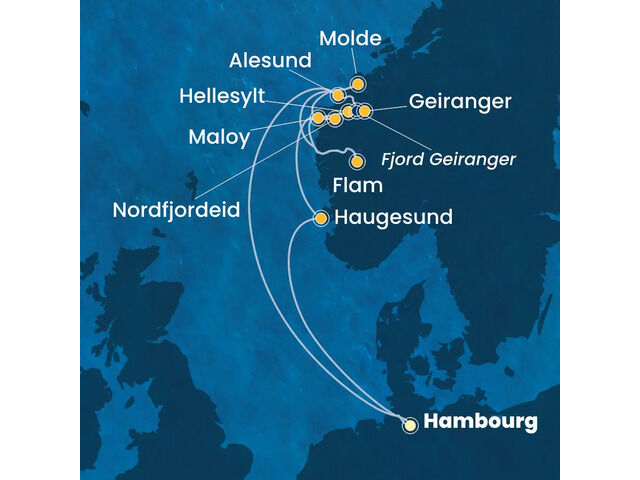Embarquez depuis l’Allemagne ou Copenhague pour une aventure maritime extraordinaire le long des majestueux fjords norvégiens, où la beauté sauvage de la nature se dévoile à chaque virage